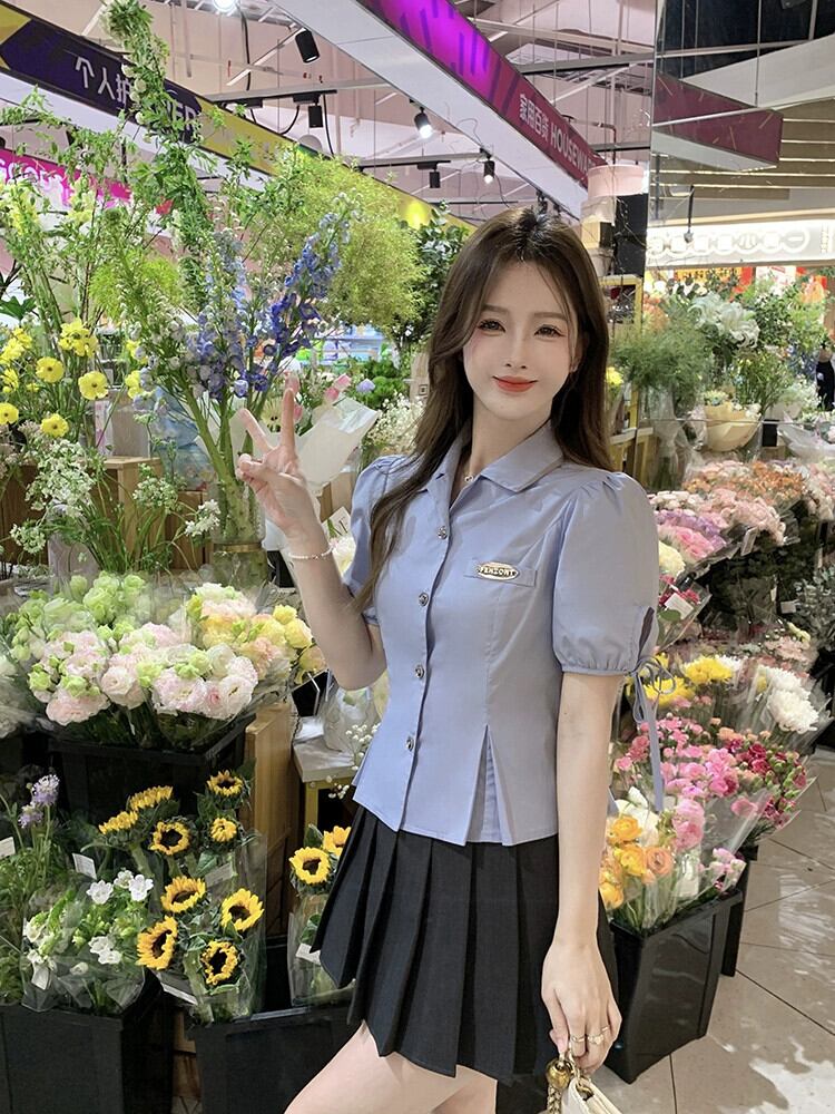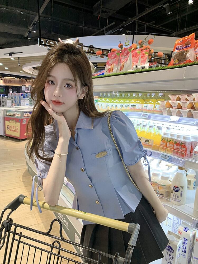 ウエストショートトップ女性の夏のデザインセンスニッチカレッジスタイル小男性ユニークでシックなブルー半袖シャツ サマー 夏物 8571629295097973