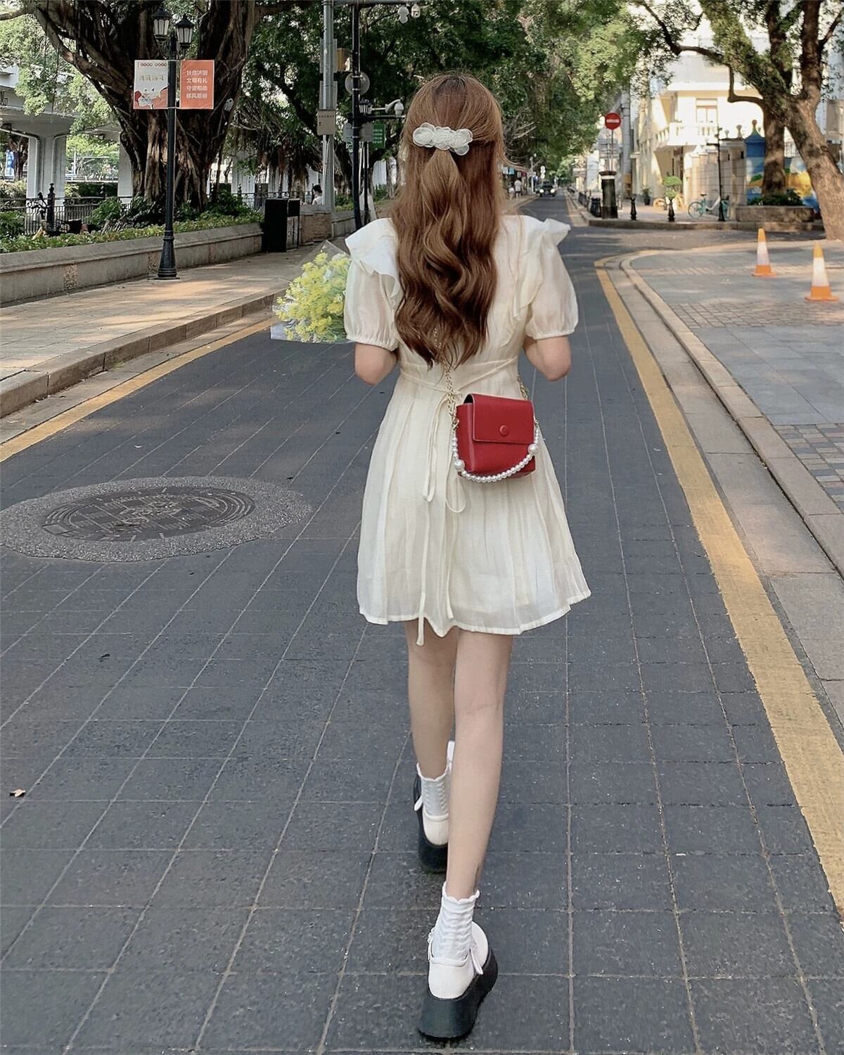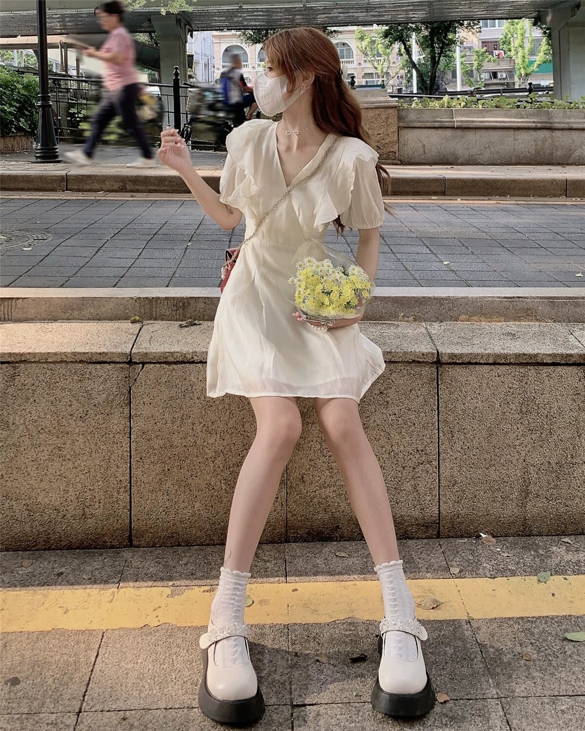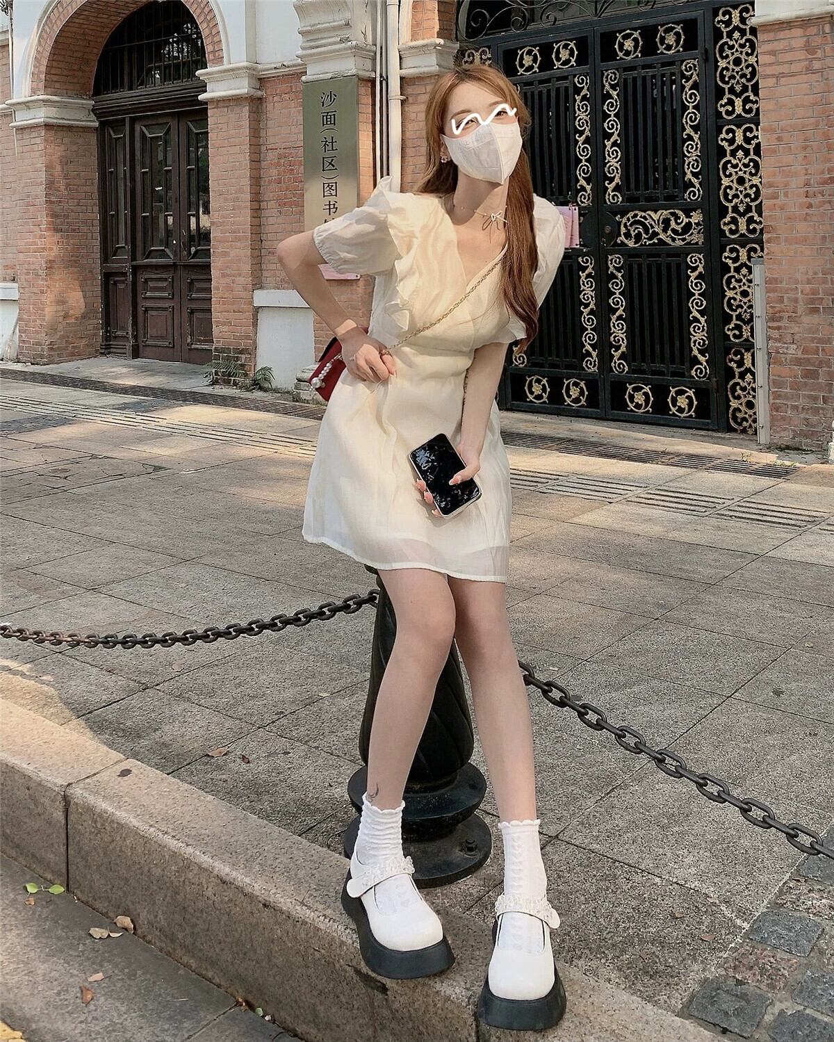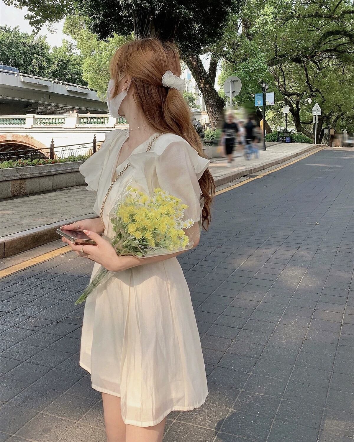ライトアプリコット V ネックドレスの女性の 2023 夏の新しいフランスの気質のハイエンドのデザインセンスニッチショートスカート サマー 夏物 Vネック 8571694436583542