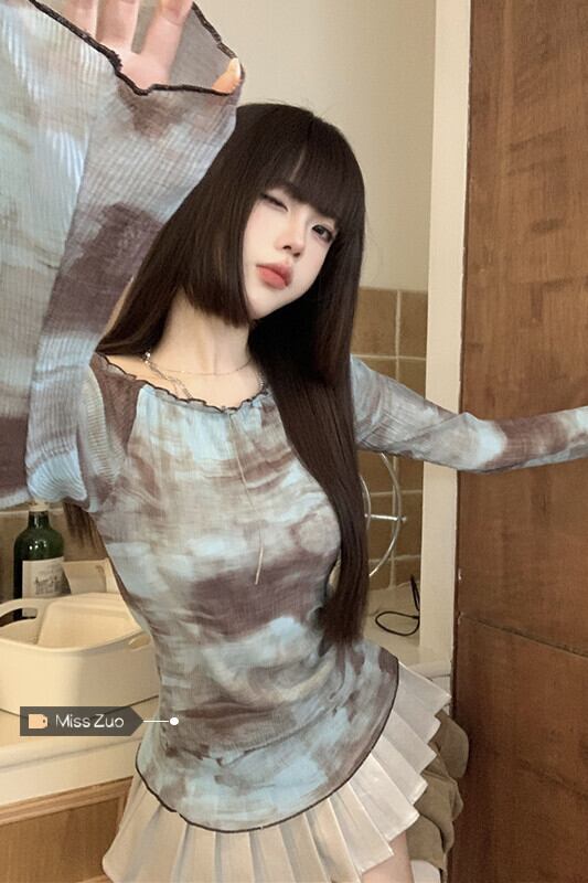 ワンショルダートップレディース2023春新デザインセンスニッチ純粋欲望ベイビータイダイプリント長袖Tシャツ ロング スプリング 春物 ピュア 8571641443447023
