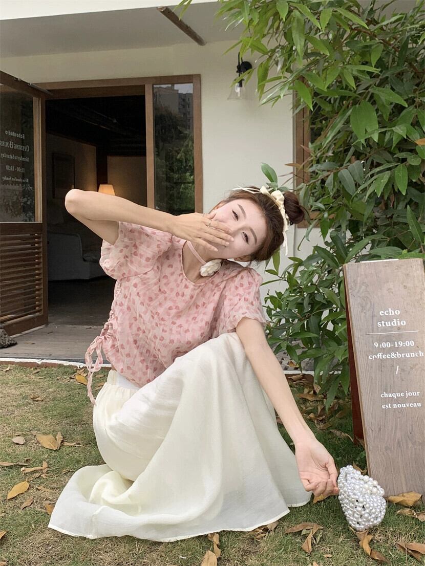 パフスリーブショートトップレディースサマーデザイン少人数感甘くて年齢を軽減する小さな巾着半袖花柄シャツ 大人ガーリー スウィート キュート カジュアル 夏物 8571689973341743
