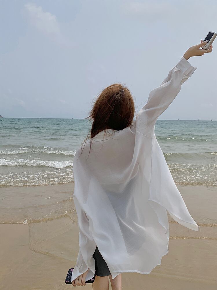 白い日焼け止めシャツジャケット女性の夏の薄いシャツ 2023 新しいシックなシックな長袖トップ ロング ホワイト サマー 夏物 8571699843689208