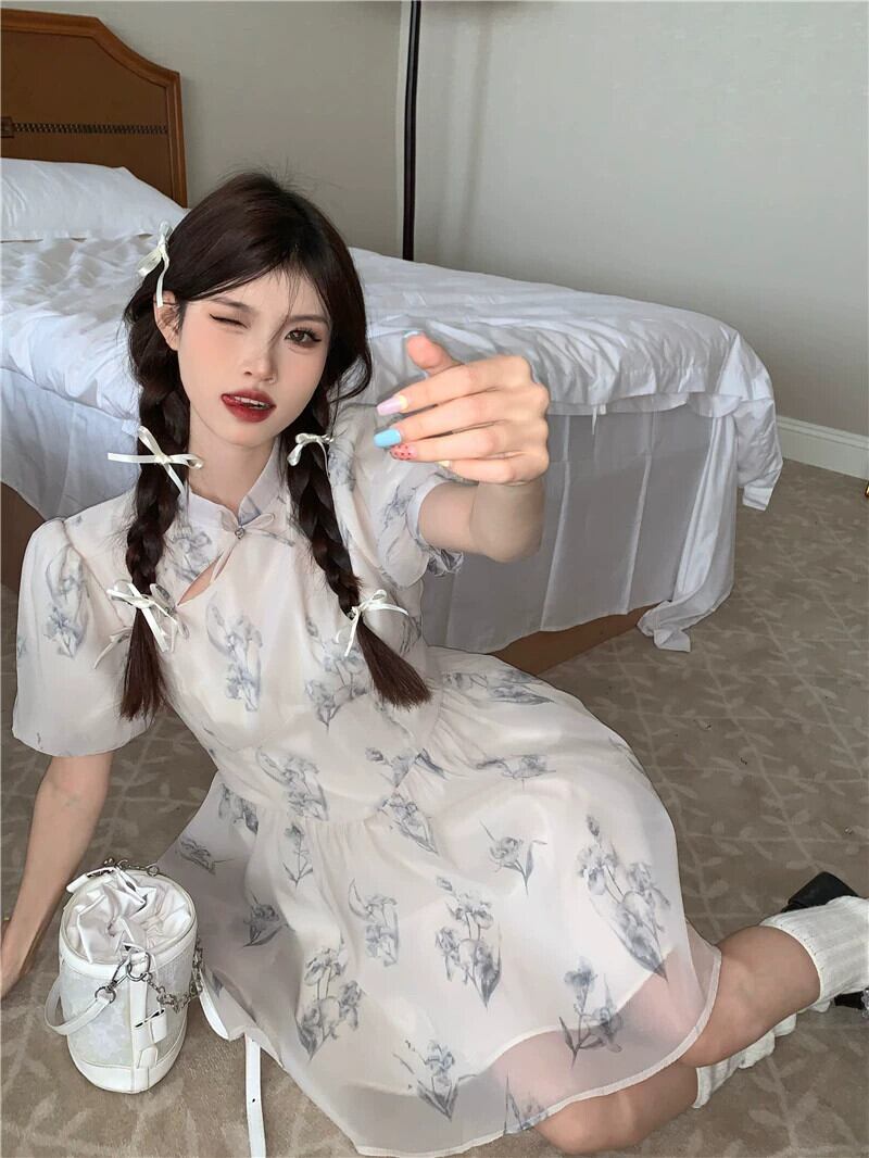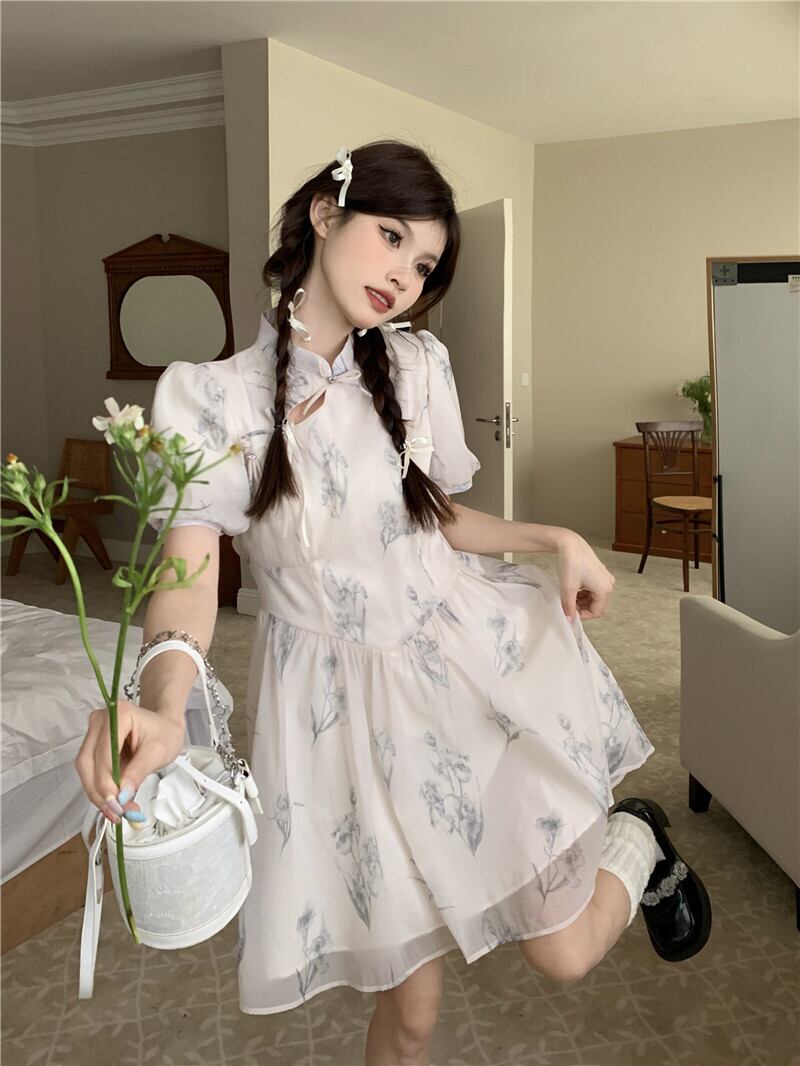 改良されたチャイナドレス女性の夏の2023新しい新しい中国風国民風優しい気質ニッチパフスリーブスカート サマー 夏物 8571657806378510