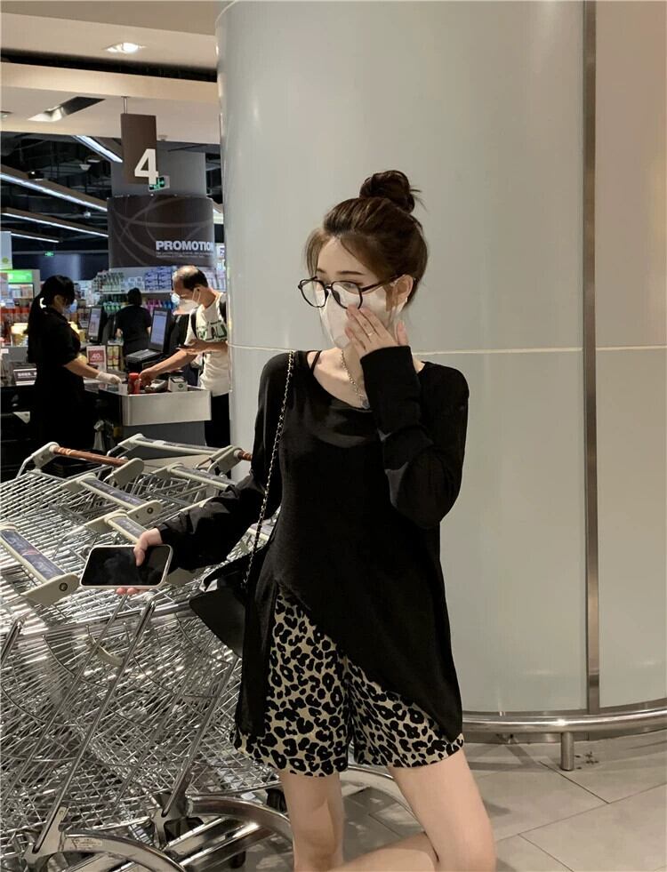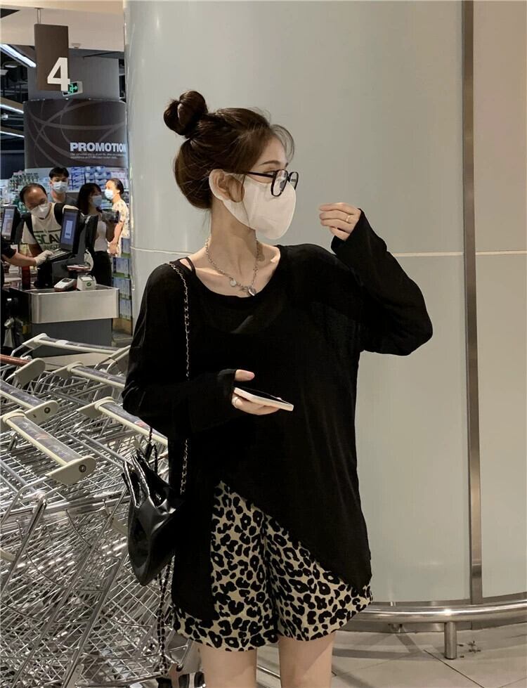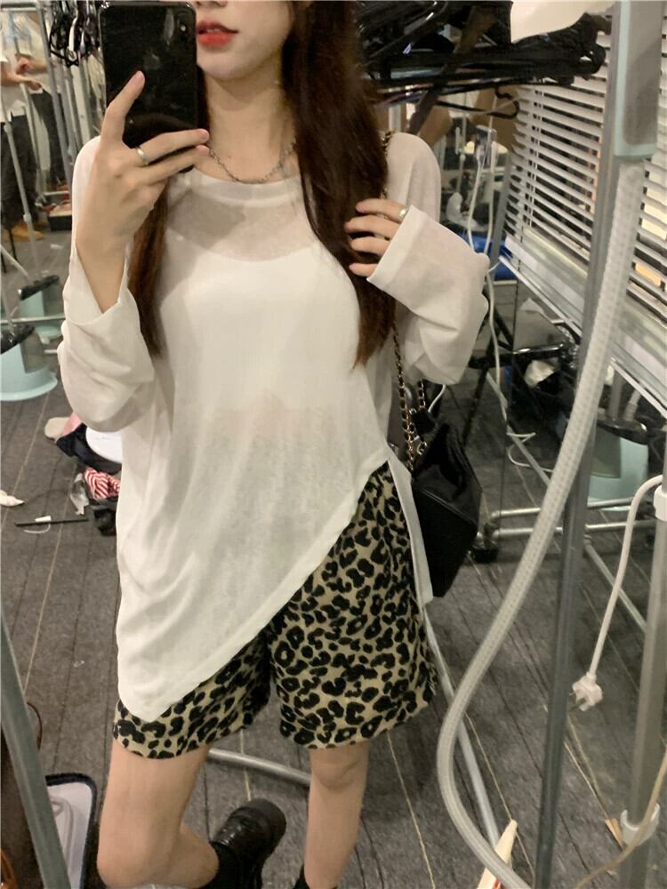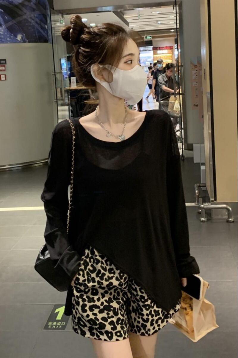 黒の長袖 T シャツの女性の夏薄い日焼け止めブラウス デザイン センス ニッチ ルーズ スリット不規則な上服 ロング ブラック サマー 夏物 Tシャツ 857161267328950