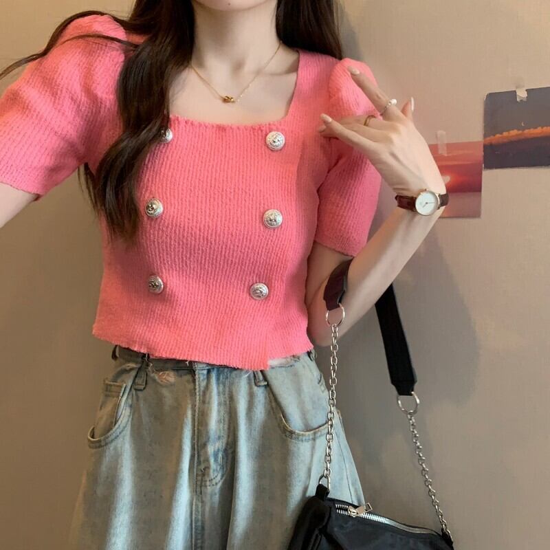 白いニット半袖婦人服2023年夏新スタイルユニークで高級感のある超素敵なスリムショートトップ ホワイト サマー 夏物 8571693958008420