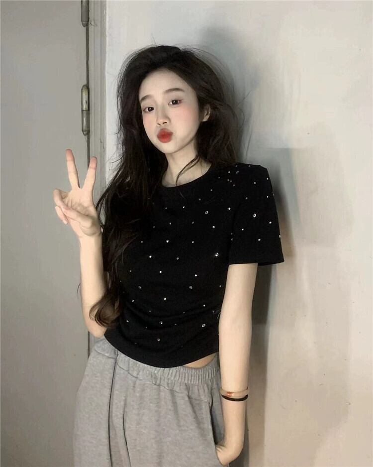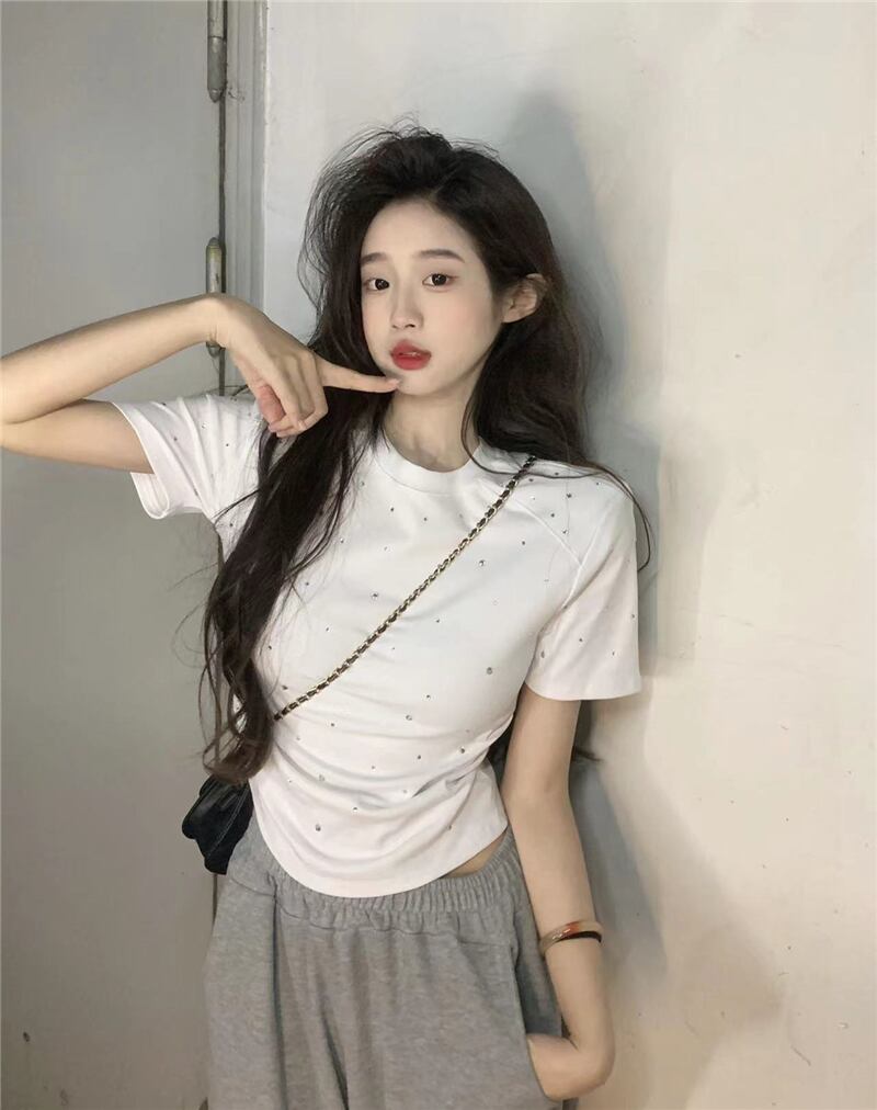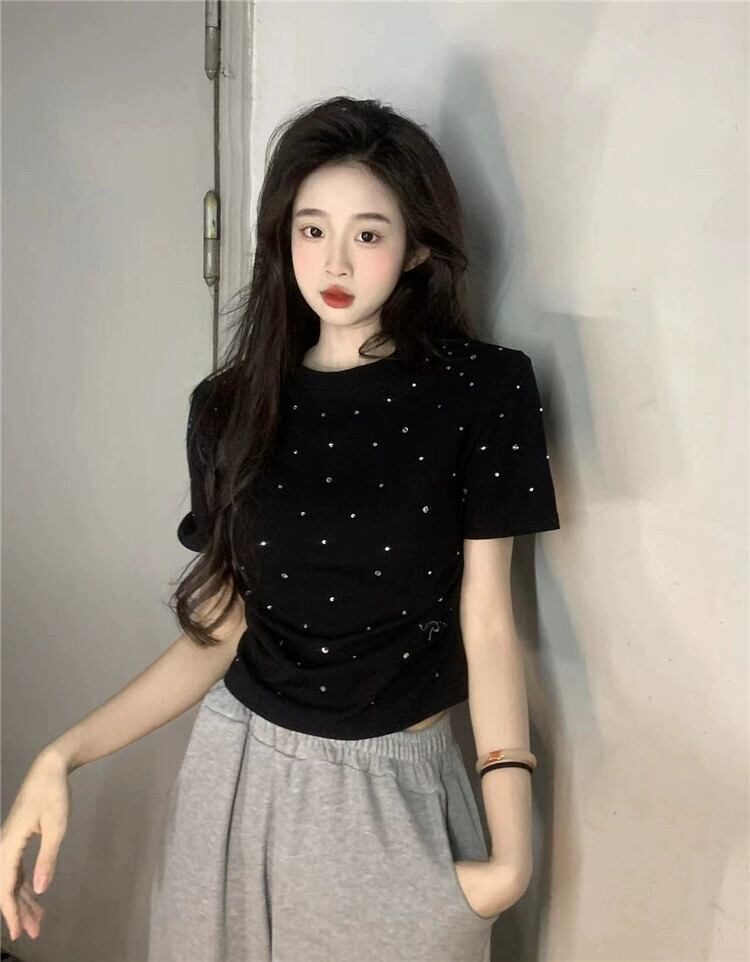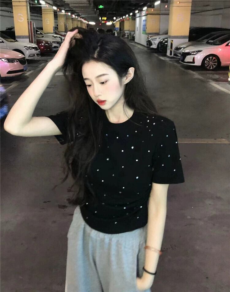 ブラックフロントショルダー半袖Tシャツレディース夏デザインセンスニッチ2023新しいスタイルシックでシックなスリムトップス サマー 夏物 857168506160380