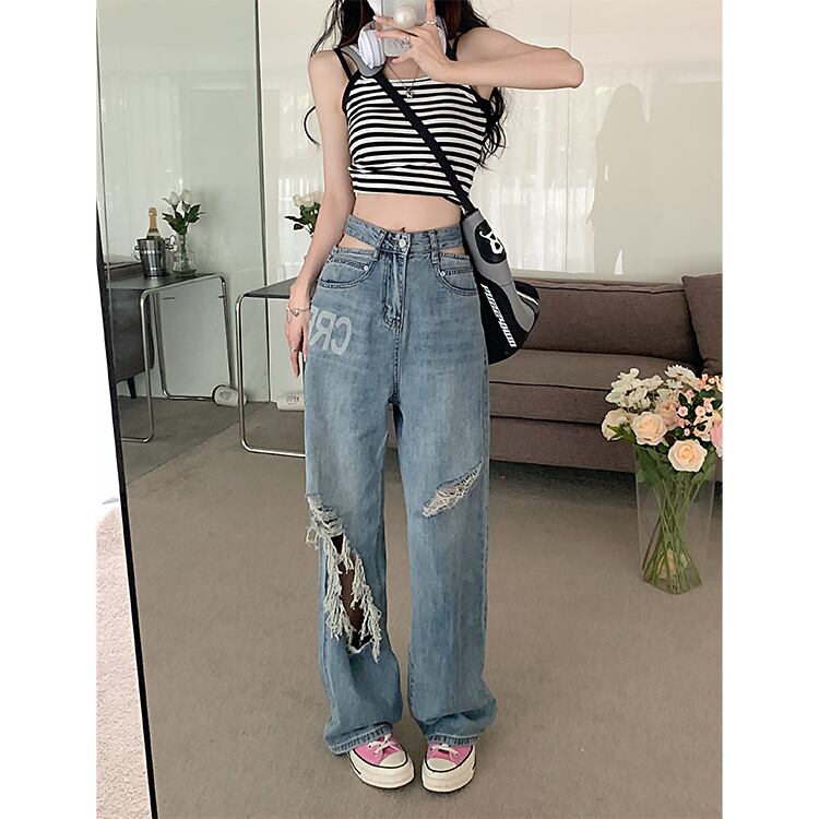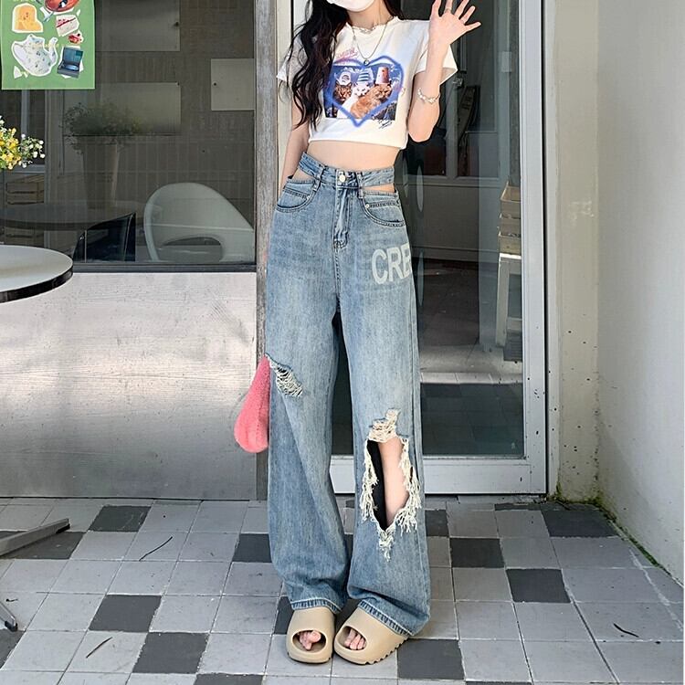 ブルーリップドジーンズレディースルーズストレートハイウエストワイドレッグパンツモップパンツ夏デザインセンス小さいパンツ ハイウェスト サマー 夏物 ワイドパンツ 8571661745385362
