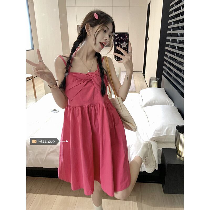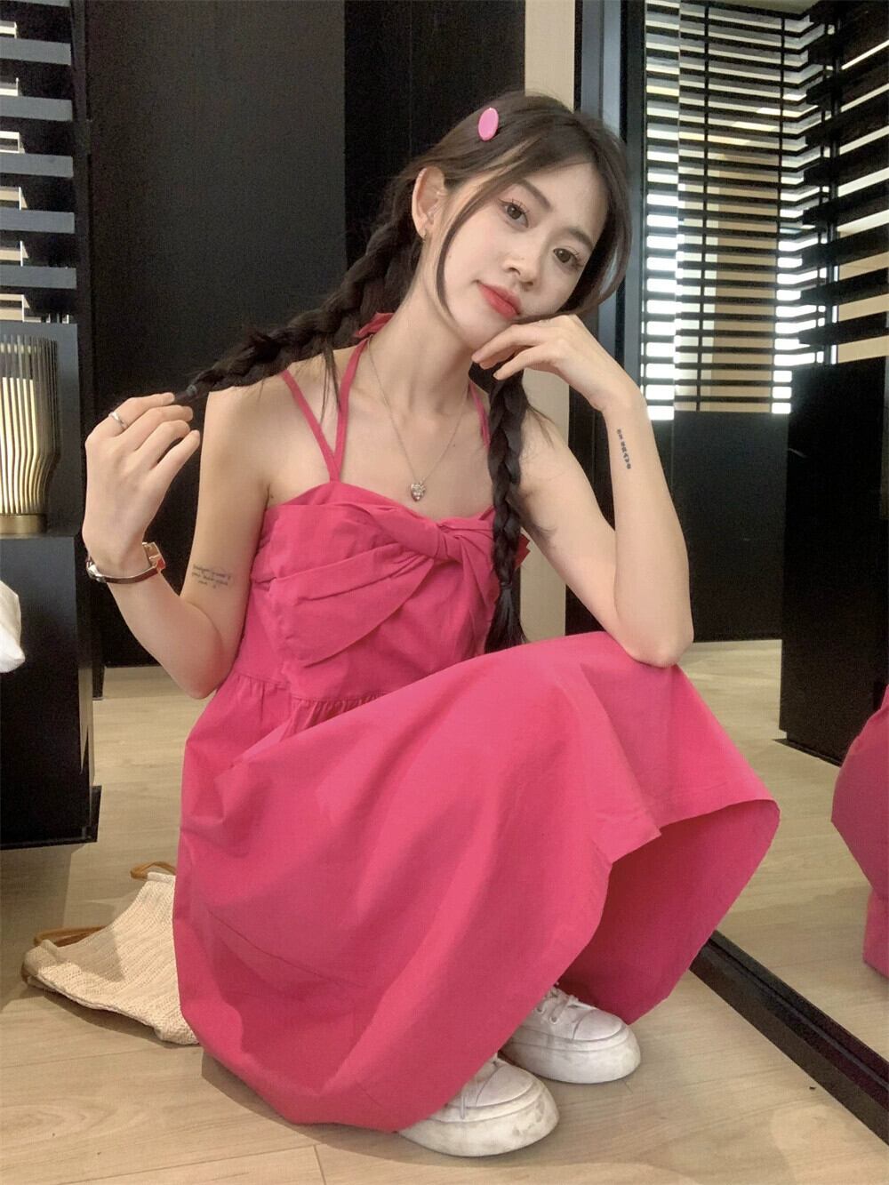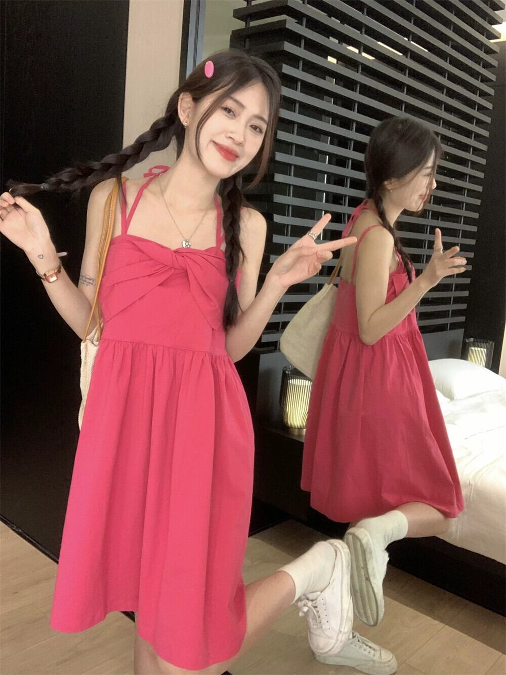 ローズレッドスリングドレス女性小男性夏2023新しい甘くてユニークなちょう結びショートスカート リボン 大人ガーリー スウィート キュート カジュアル サマー 夏物 8571692144305311