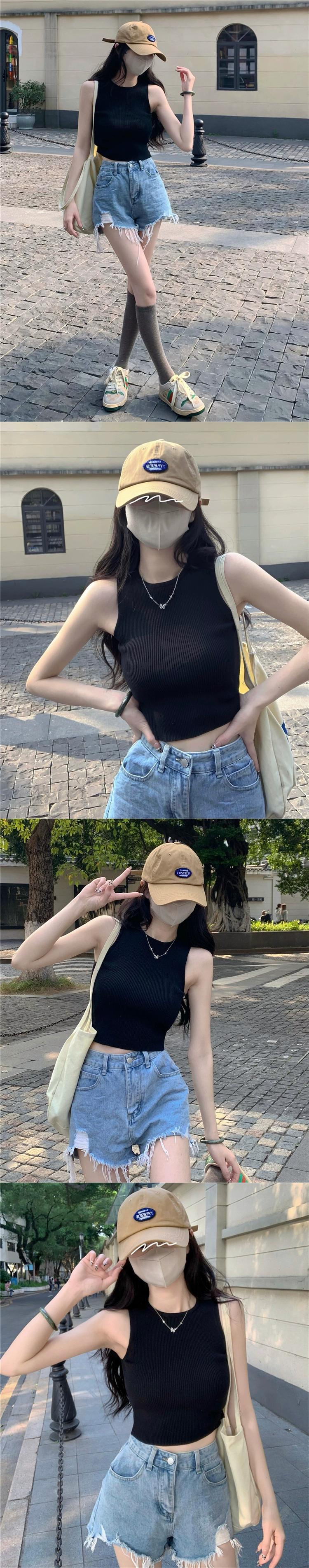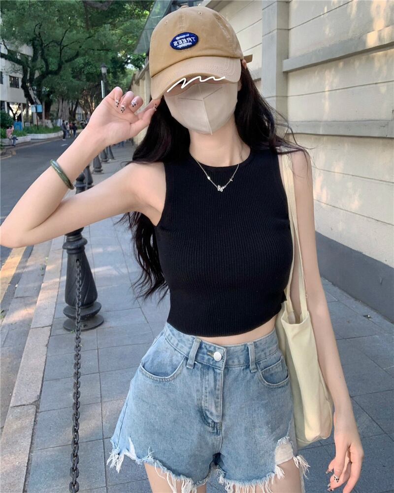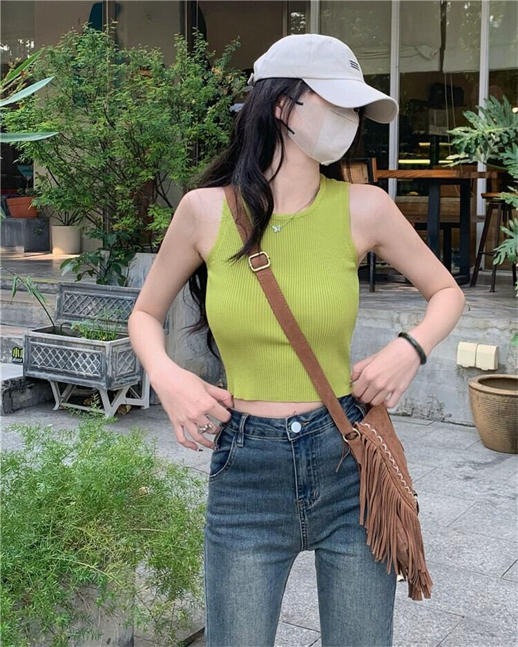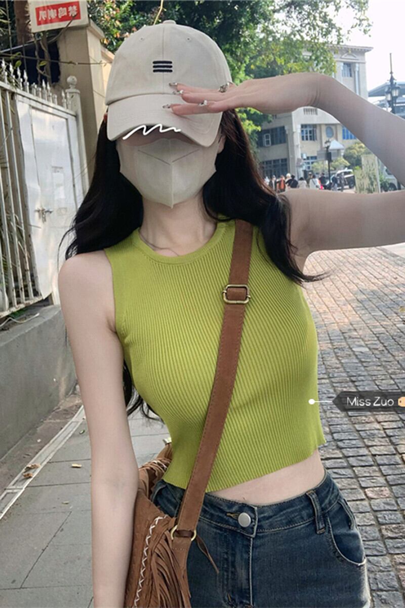 緑のニット小さなベスト女性は夏に包まれた胸の外側セクシーなシックなノースリーブ底ショートトップを着用します サマー 夏物 グリーン 8571644799601379
