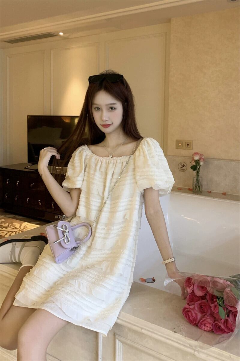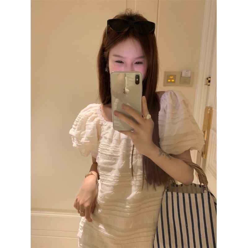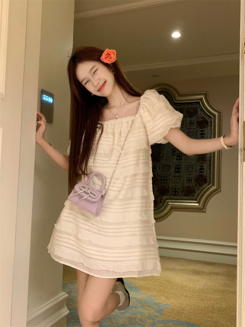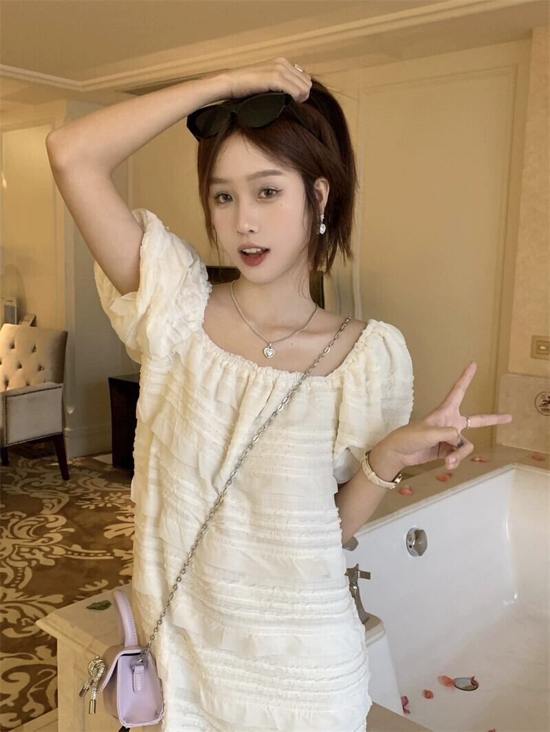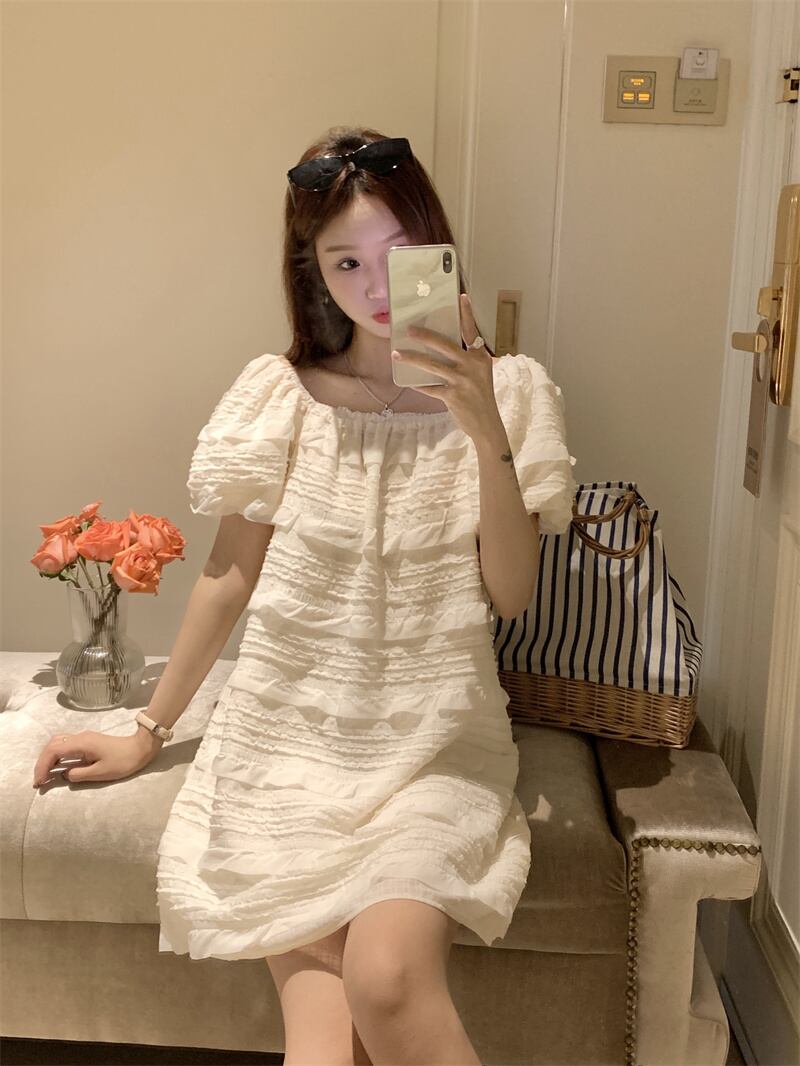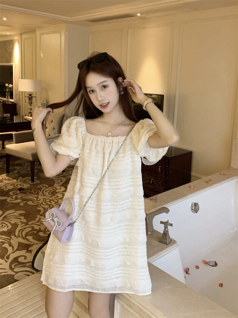 パフスリーブスクエアカラードレス女性の夏2023新しい甘くて優しい風初恋小さな人形ショートスカート 大人ガーリー スウィート キュート カジュアル サマー 夏物 スクウェア 8571692832013627