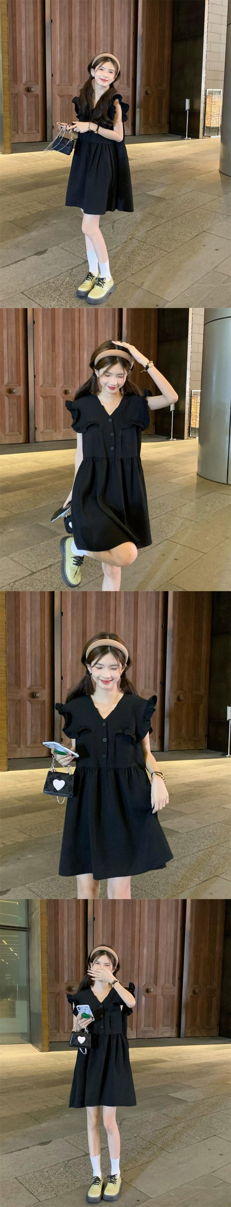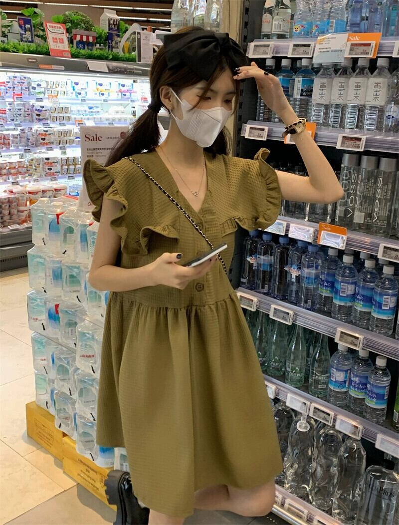 カーキ V ネックドレスの女性の 2023 夏の新しいフランスの甘くて優しい風小さな木耳スカート 大人ガーリー スウィート キュート カジュアル サマー 夏物 Vネック 857165046260157