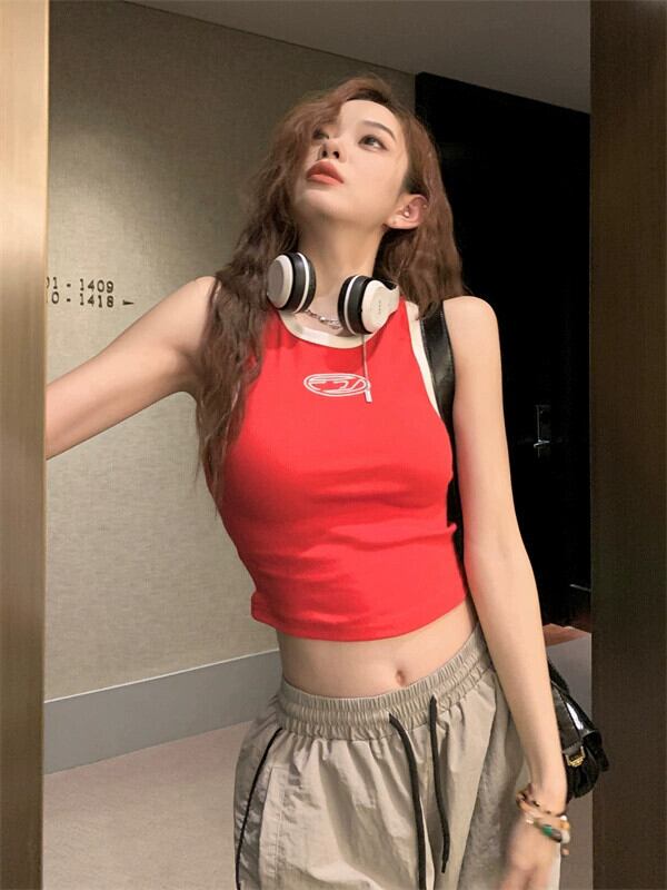 レッドアメリカンスタイルベストレディースアウターウェア夏着シックスイートスリムフィットショートノースリーブTシャツトップ 半袖 ハーフスリーブ 大人ガーリー スウィート キュート カジュアル サマー 夏物 8571688393079141