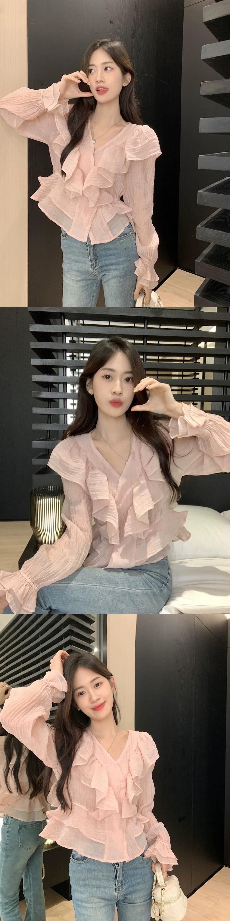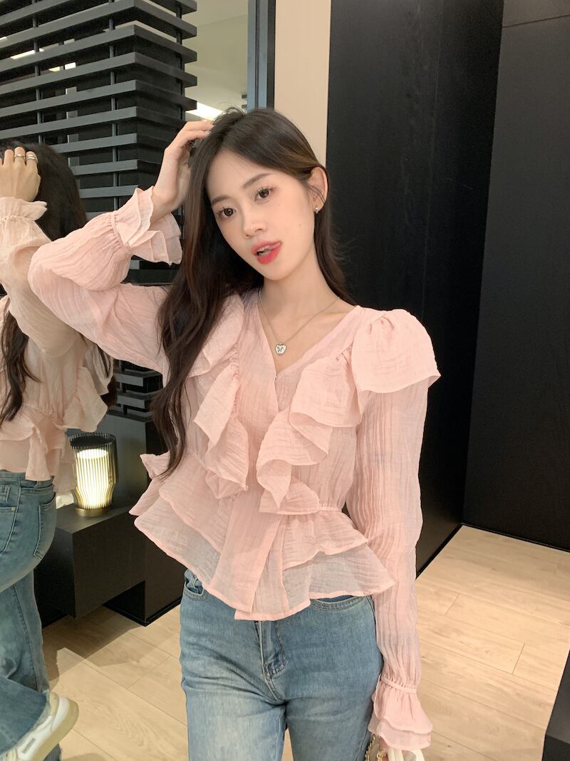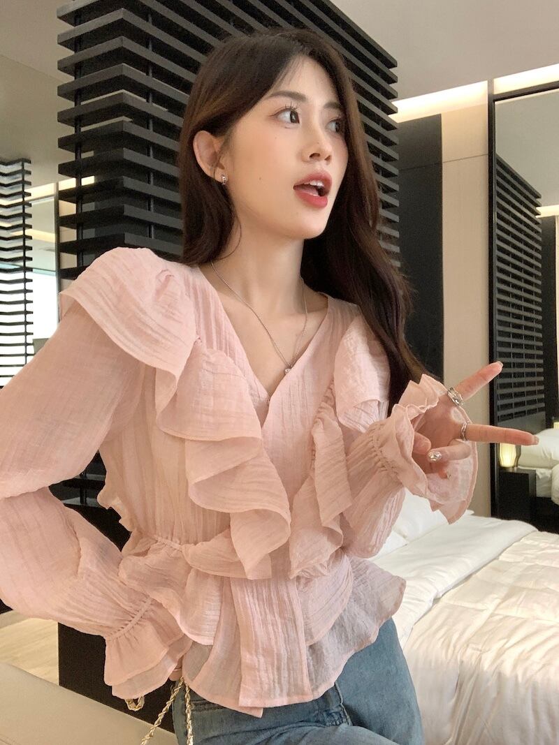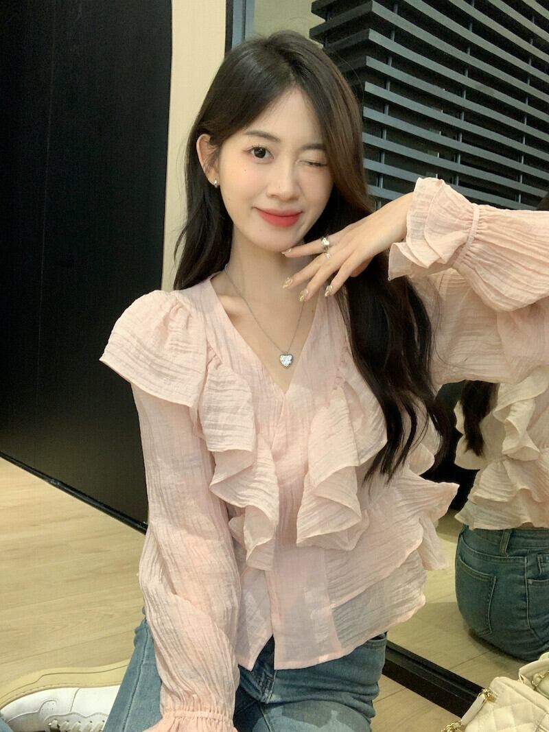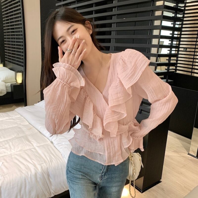 フリルエッジVネックショートトップスレディース春デザインセンスニッチフレンチ優しいピンクのトランペットスリーブシフォンシャツ スプリング 春物 8571667389457319