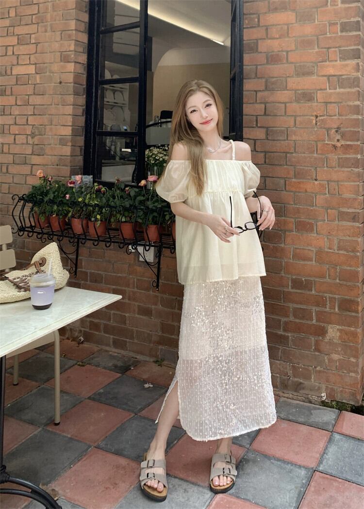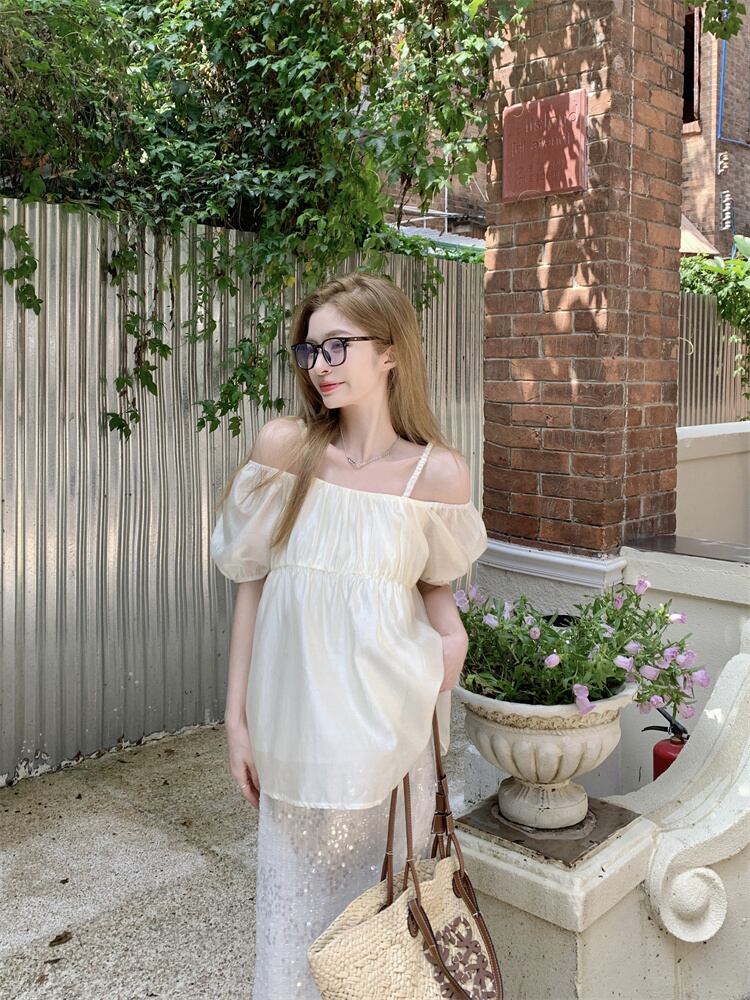 ワンショルダーサスペンダートップレディース夏デザインセンスニッチ2023新しい優しいスタイルスーパーフェアリーアプリコット半袖シャツ サマー 夏物 8571659449552816