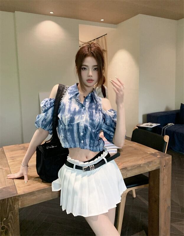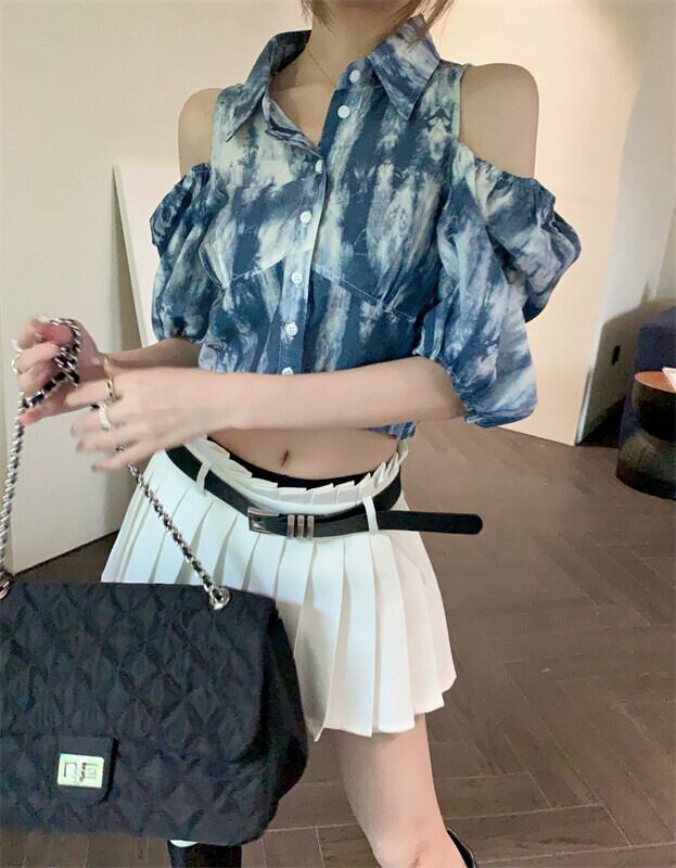 ブルー半袖シャツ女性のデザインセンスニッチシャツ夏eignスタイルユニークでシックなフレンチストラップレスショートトップ サマー 夏物 8571678363116293