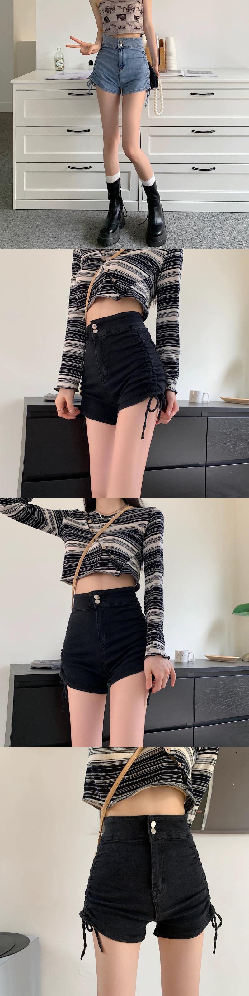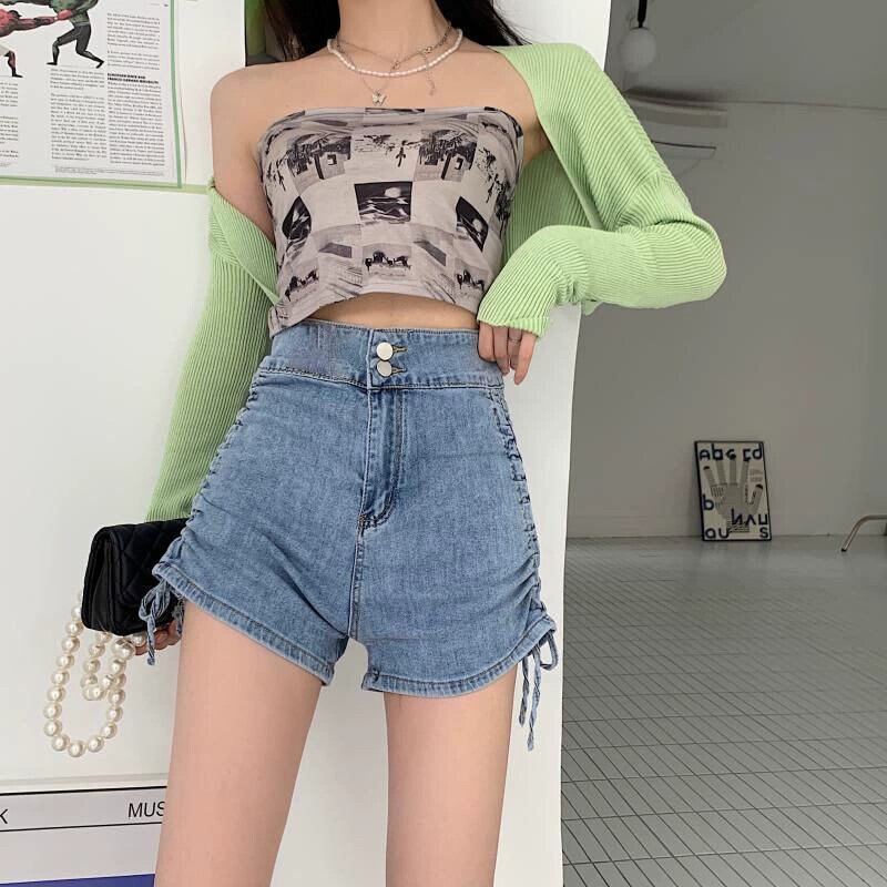 ブルー巾着デニムショートパンツレディース2023年夏新デザインセンス小さいハイウエストAラインパンツ ハイウェスト サマー 夏物 ショーツ ブルマー 8571614458460345