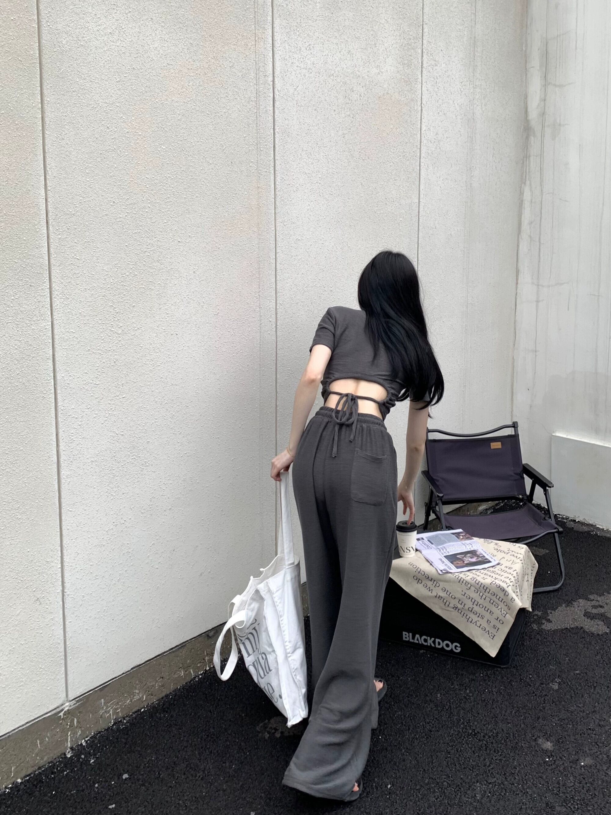 グレーフロントショルダー半袖Tシャツレディース夏デザインセンス丁寧なマシンバック中空ストラップスリムフィットショートトップ サマー 夏物 8571640484248729