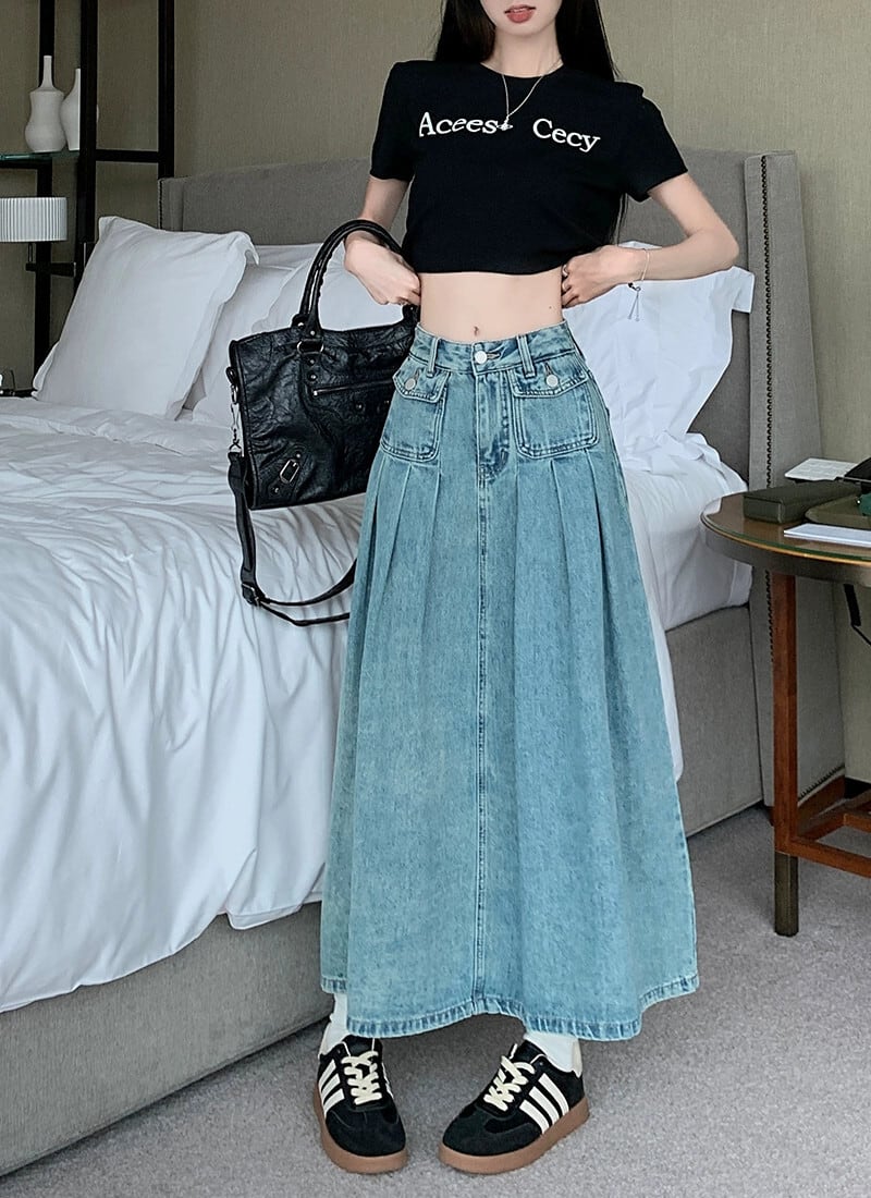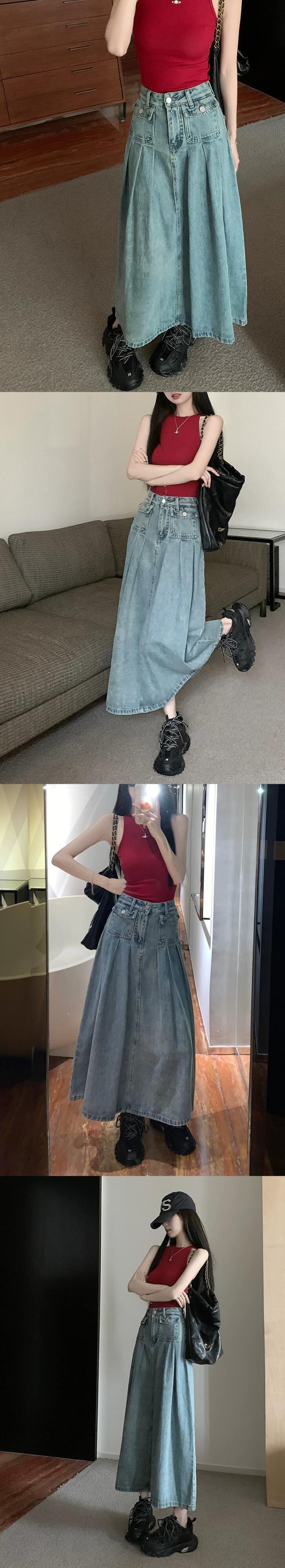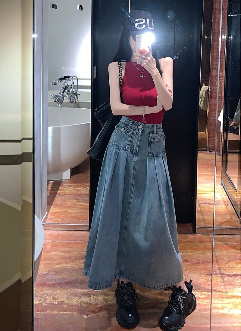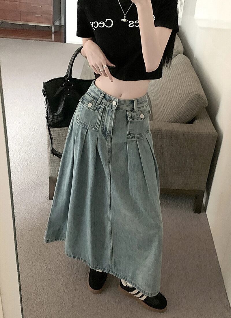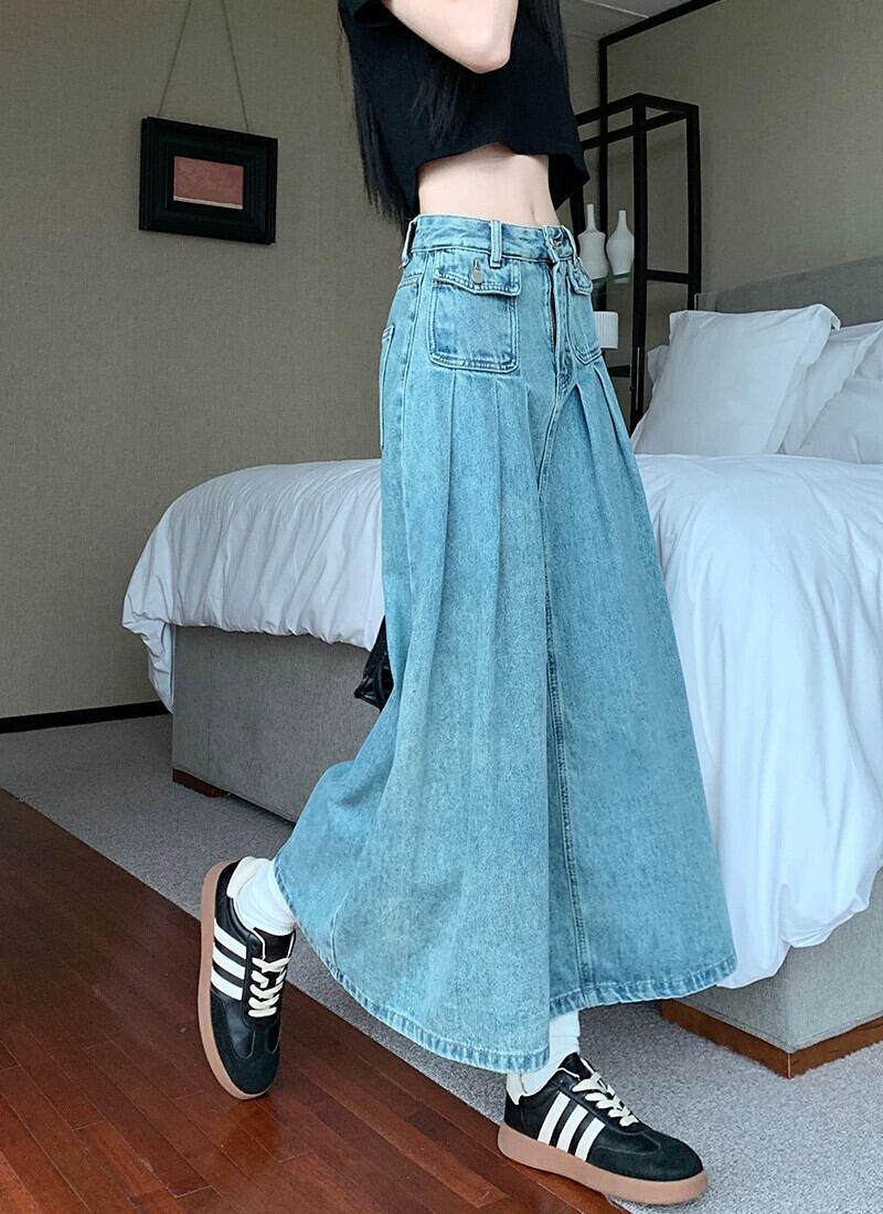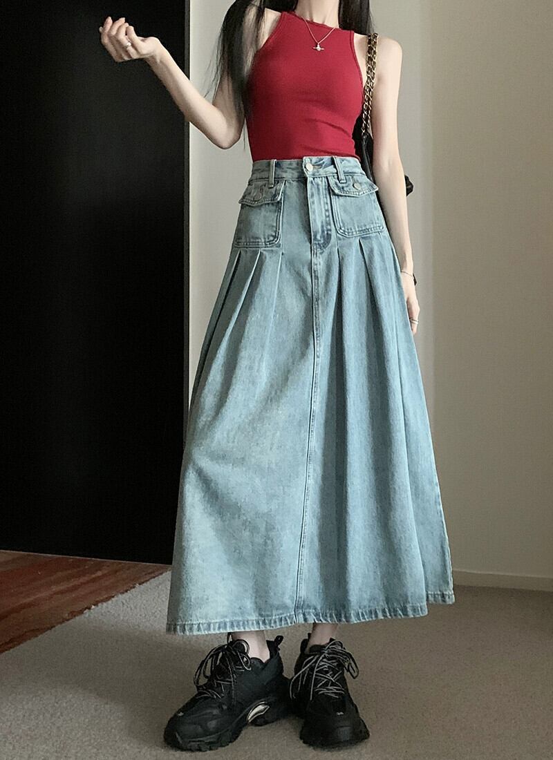 ブループリーツスカート デニムスカート レディース ハイウエスト Aラインスカート 春 洋梨体型 ミドル丈 バッグヒップ ロングスカート ハイウェスト スプリング 春物 8571682582555639