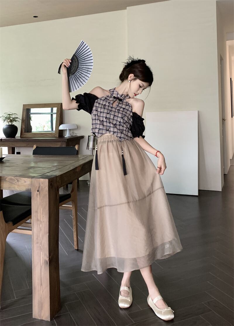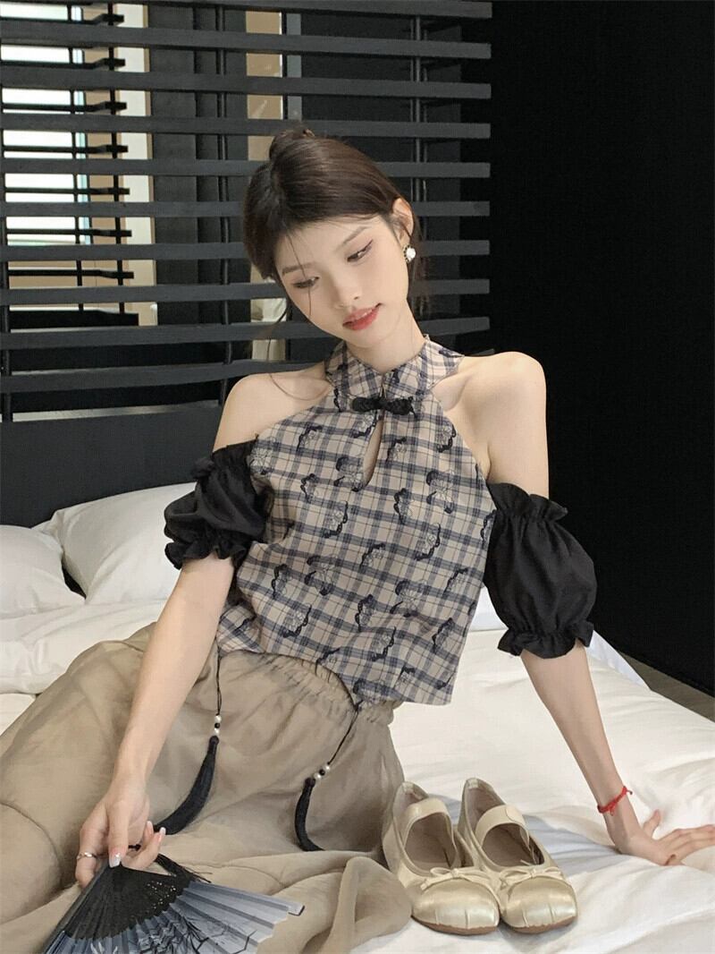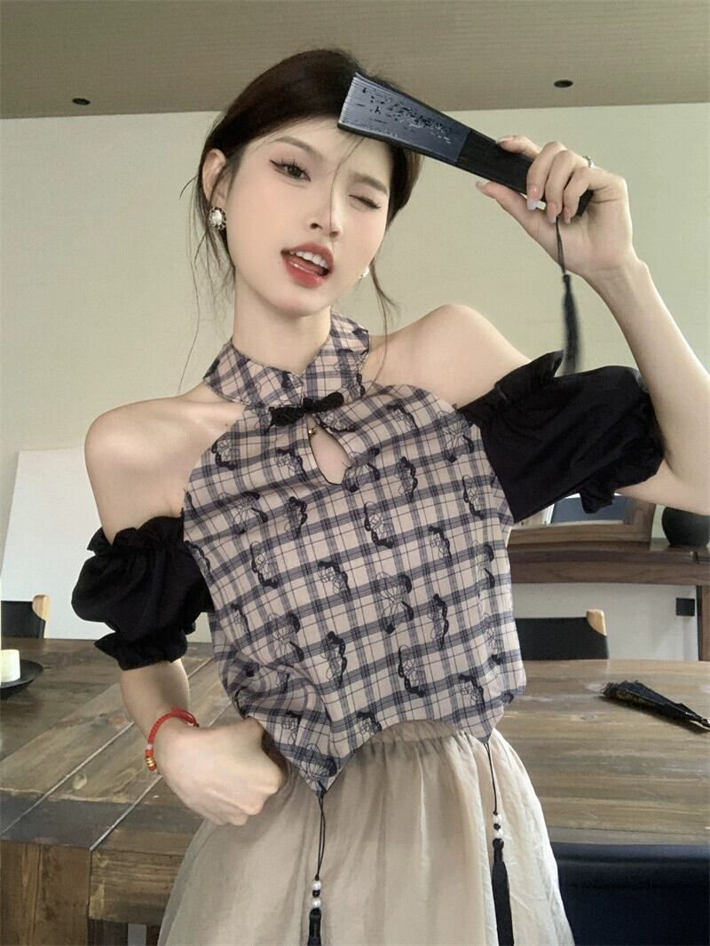 中国風オフショルダーショートトップ女性の夏のデザインセンスニッチ純粋な欲望甘くてスパイシーな超素敵な半袖チェック柄シャツ 大人ガーリー スウィート キュート カジュアル サマー 夏物 ピュア 8571617174109301
