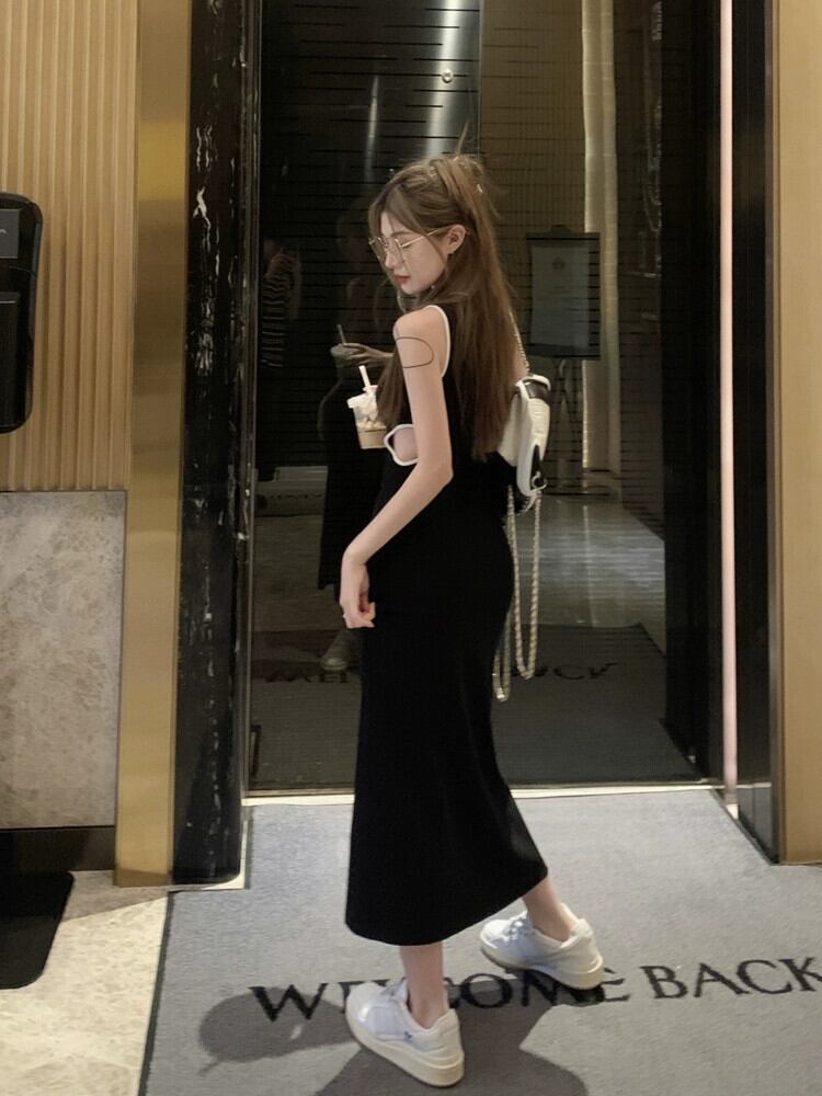黒のベストドレス女性の夏 2023 新しいニッチデザインのセクシーなスリムウエストロングスカート ブラック サマー 夏物 8571615296938128