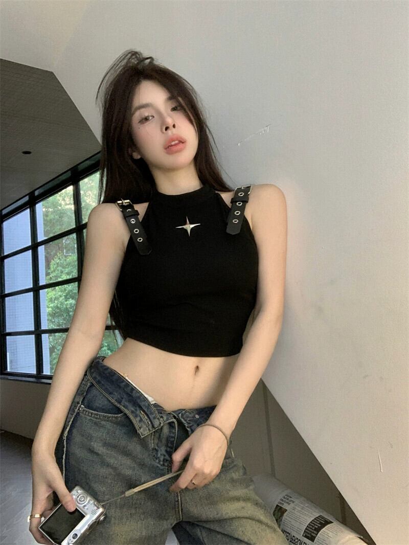 黒のベストベスト女性の夏のアウターデザインセンスニッチアメリカンレトロセクシーなノースリーブ Tシャツトップ ブラック サマー 夏物 857168011880541