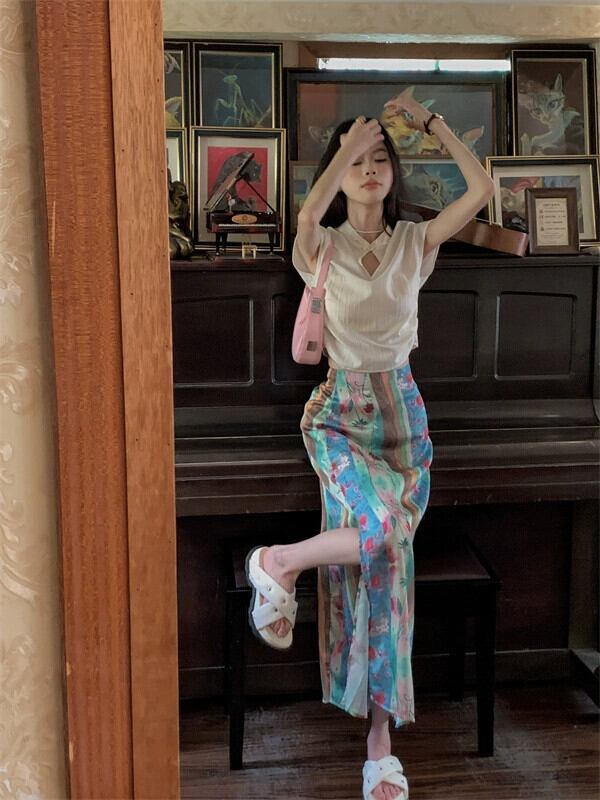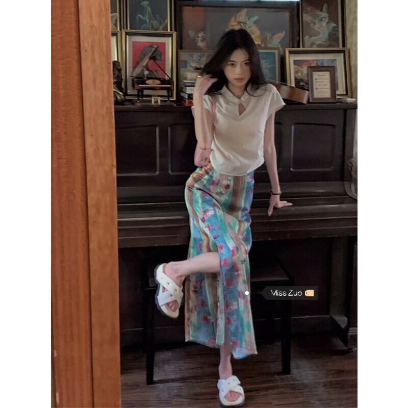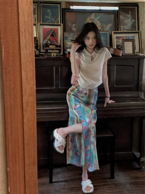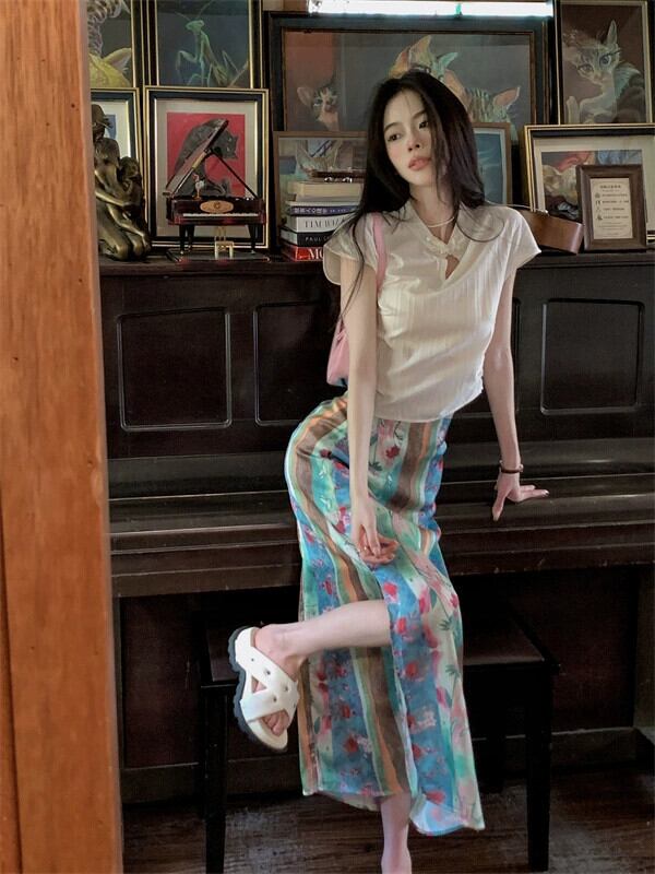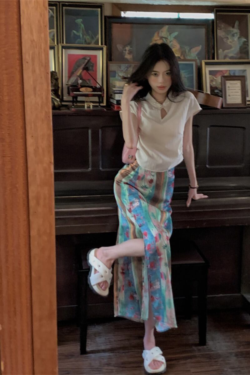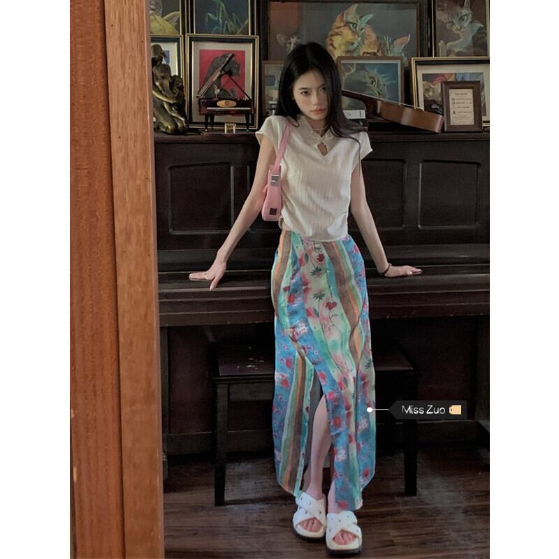 プリントスリットスカートレディース夏ハイウエストAラインスカート2023新デザインセンスミドル丈ヒップたっぷりロングスカート ハイウェスト サマー 夏物 857166475103977