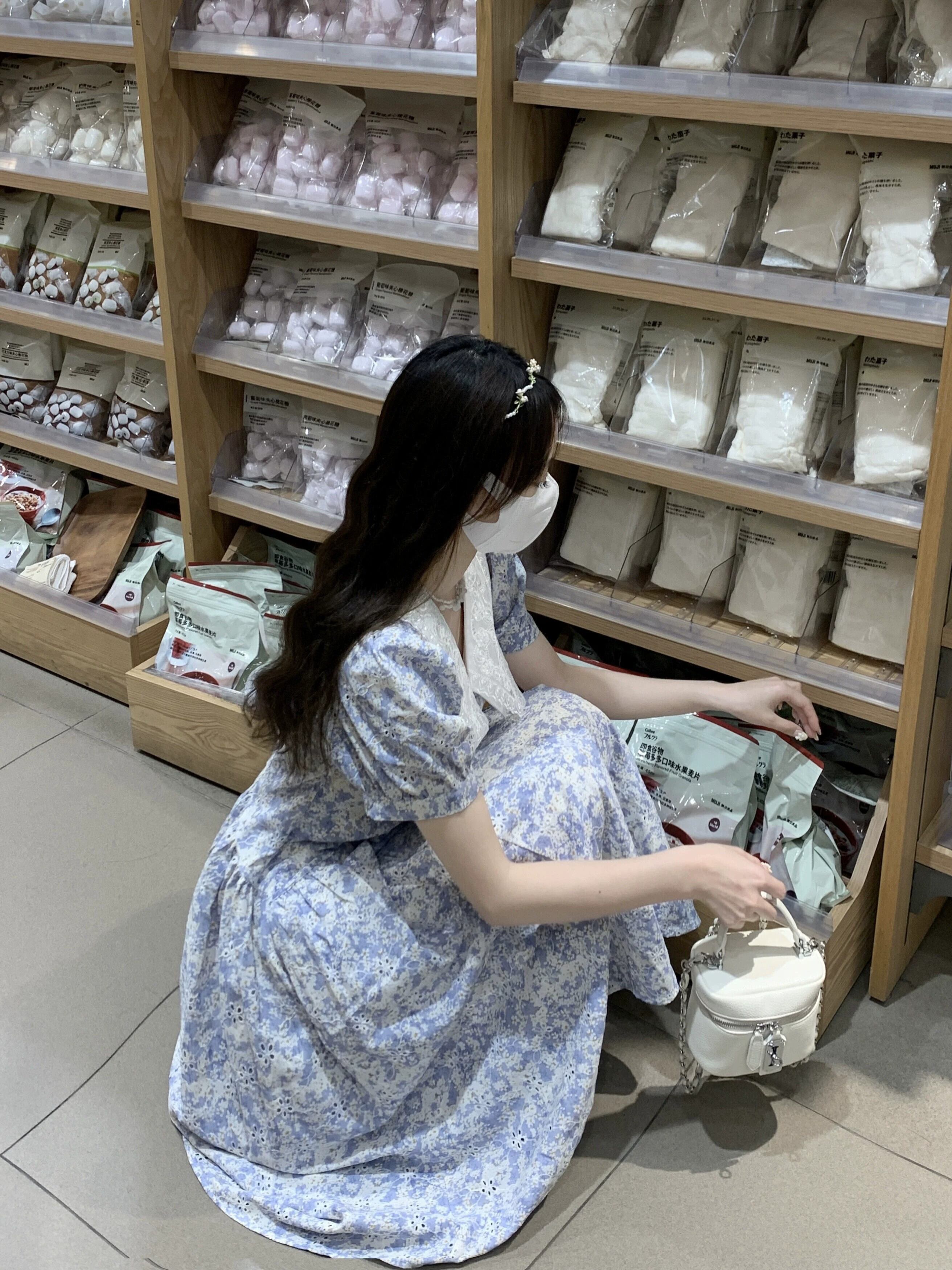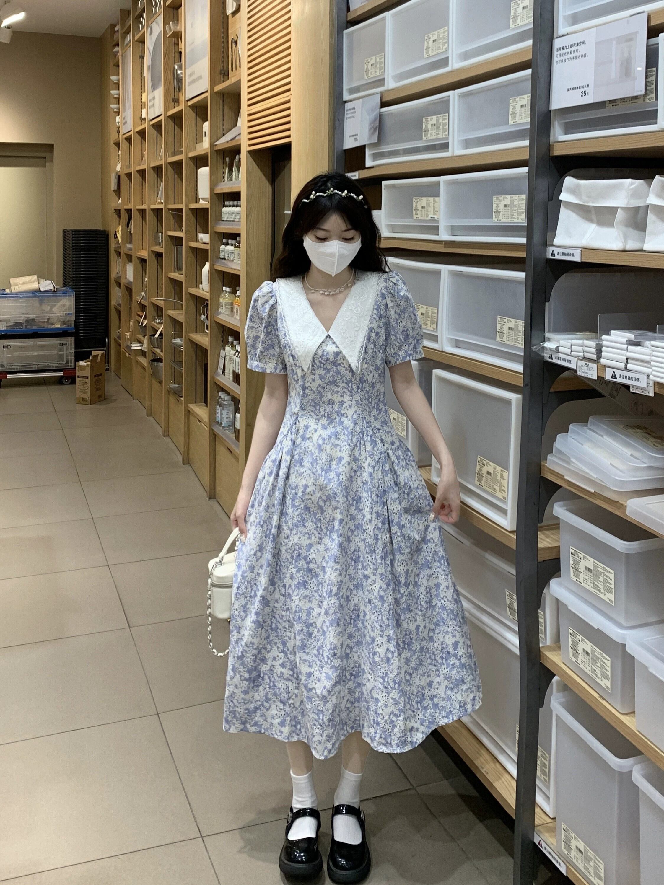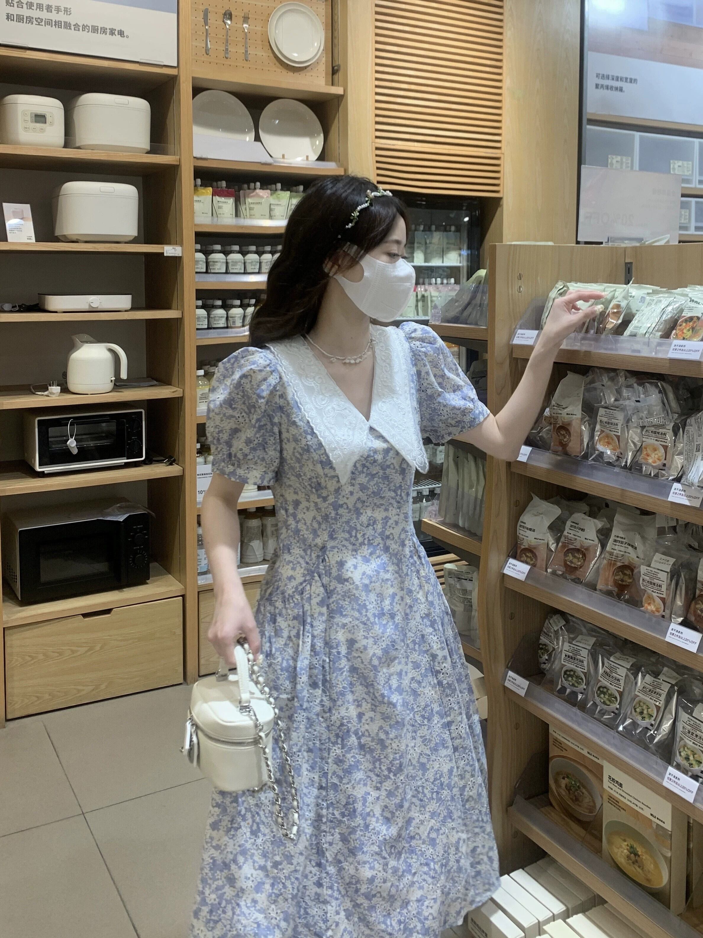 ドールカラー花柄ドレスレディース 2023 夏の新デザインセンスニッチスイートパフスリーブウエストロングスカート 大人ガーリー スウィート キュート カジュアル サマー 夏物 8571652933353157