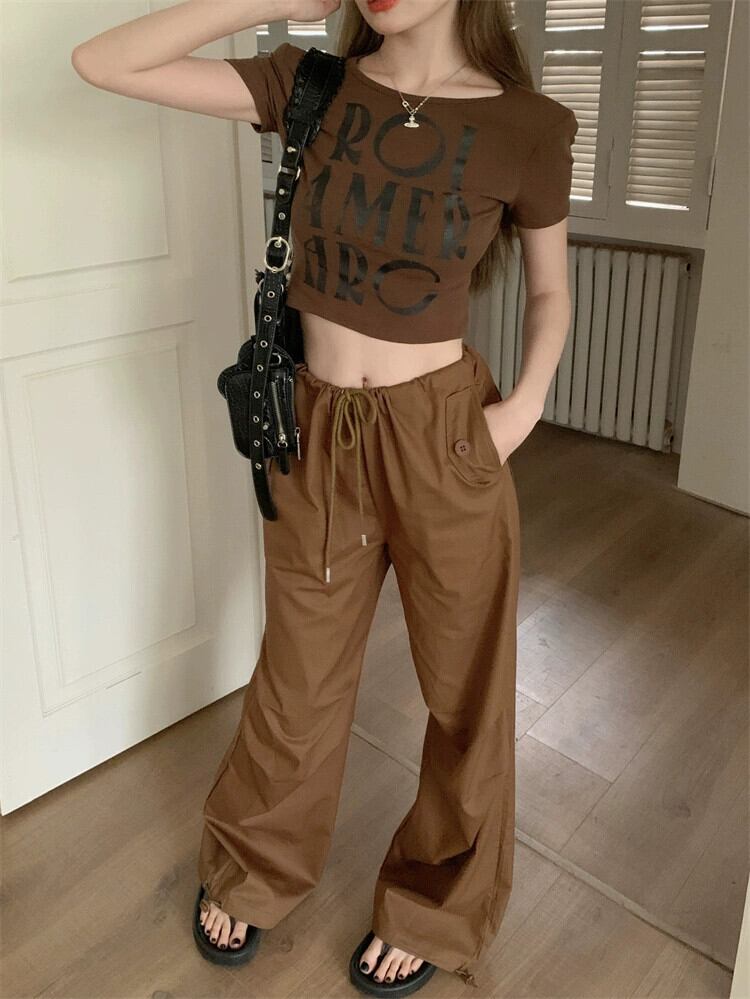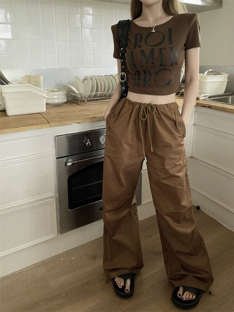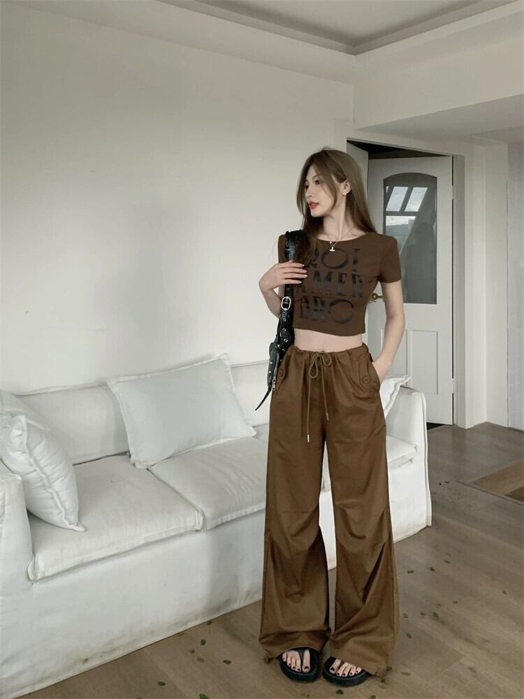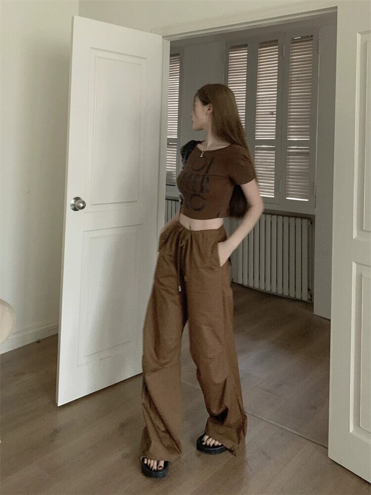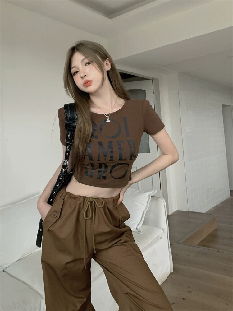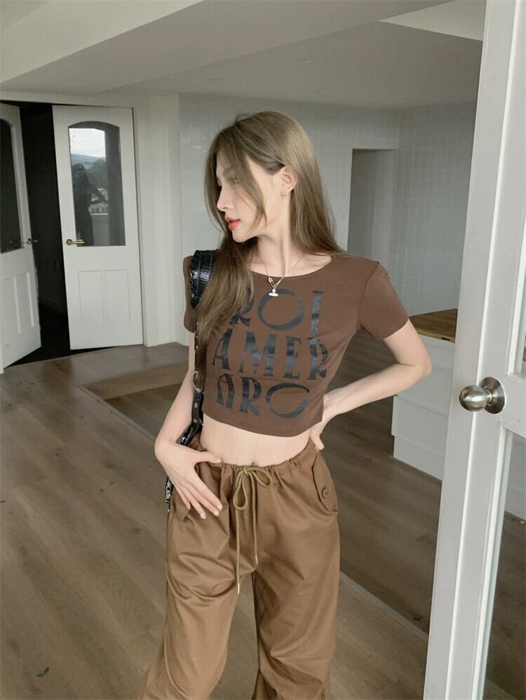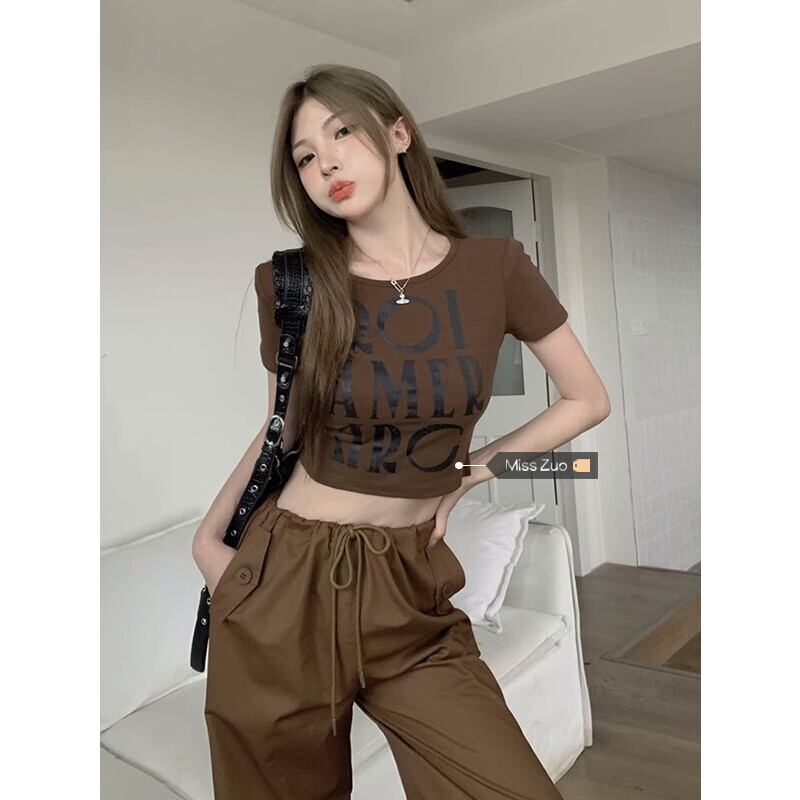 コーヒー色スリムフィットショートトップ女性デザインセンスニッチ夏ユニークシックアメリカンレトロフロントショルダー半袖Tシャツ サマー 夏物 8571638941399661