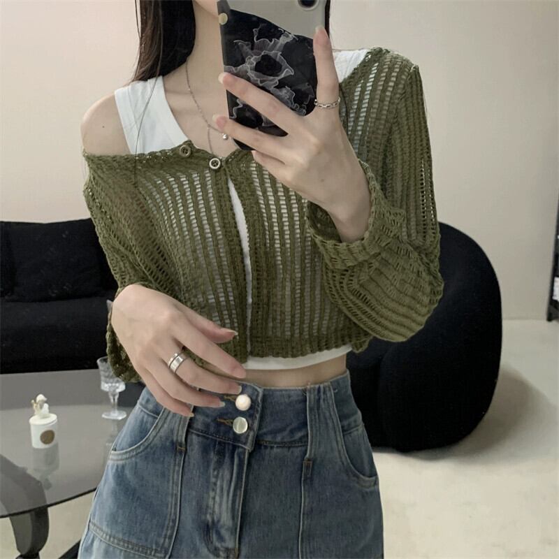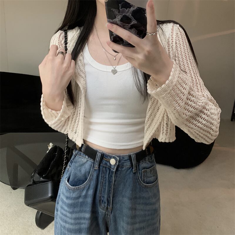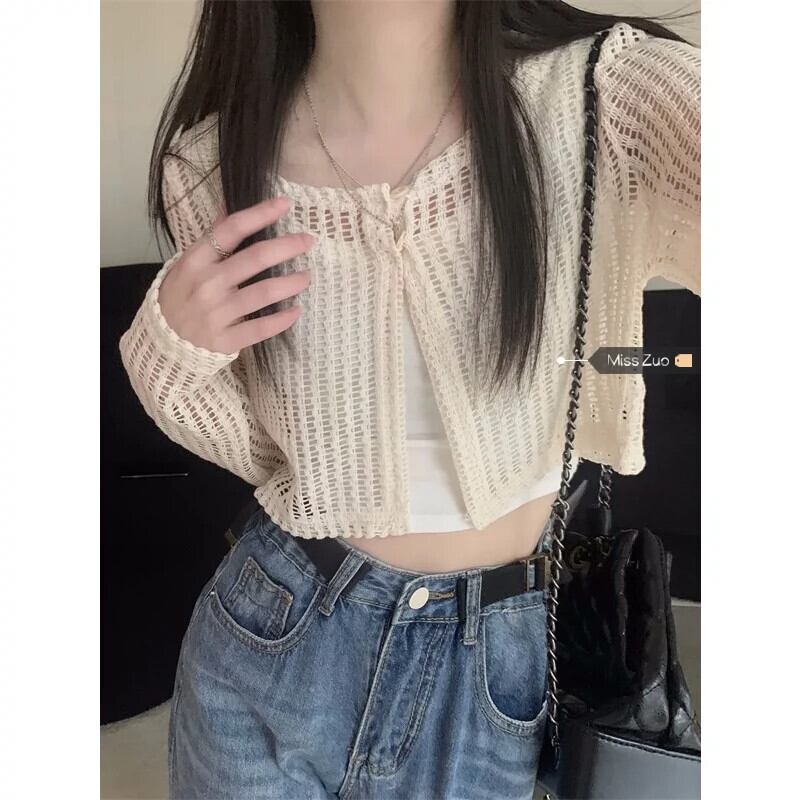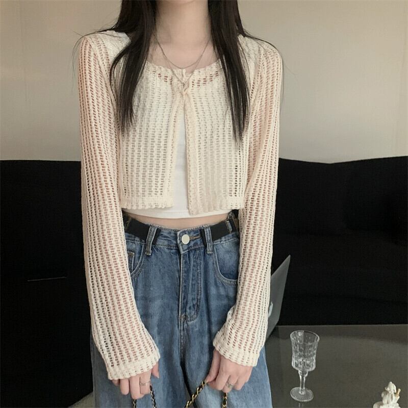 アプリコットニット日焼け止めカーディガンレディース夏薄セクションショールショートコート甘い中空ブラウストップ 大人ガーリー スウィート キュート カジュアル サマー 夏物 8571647431570897