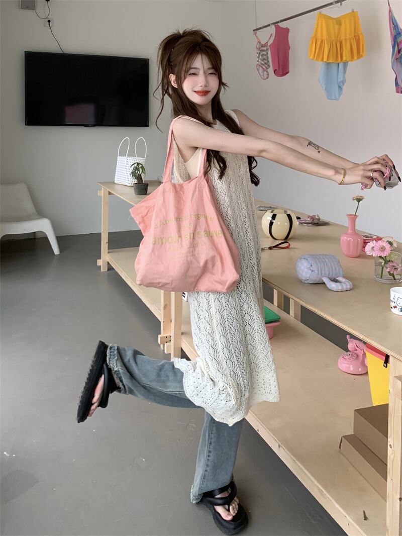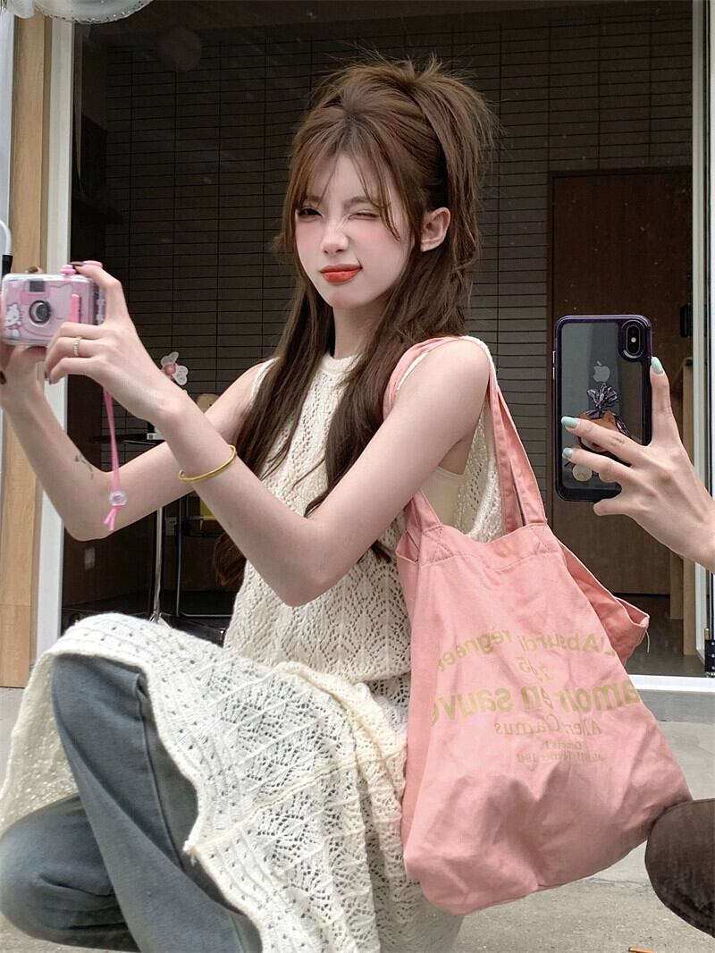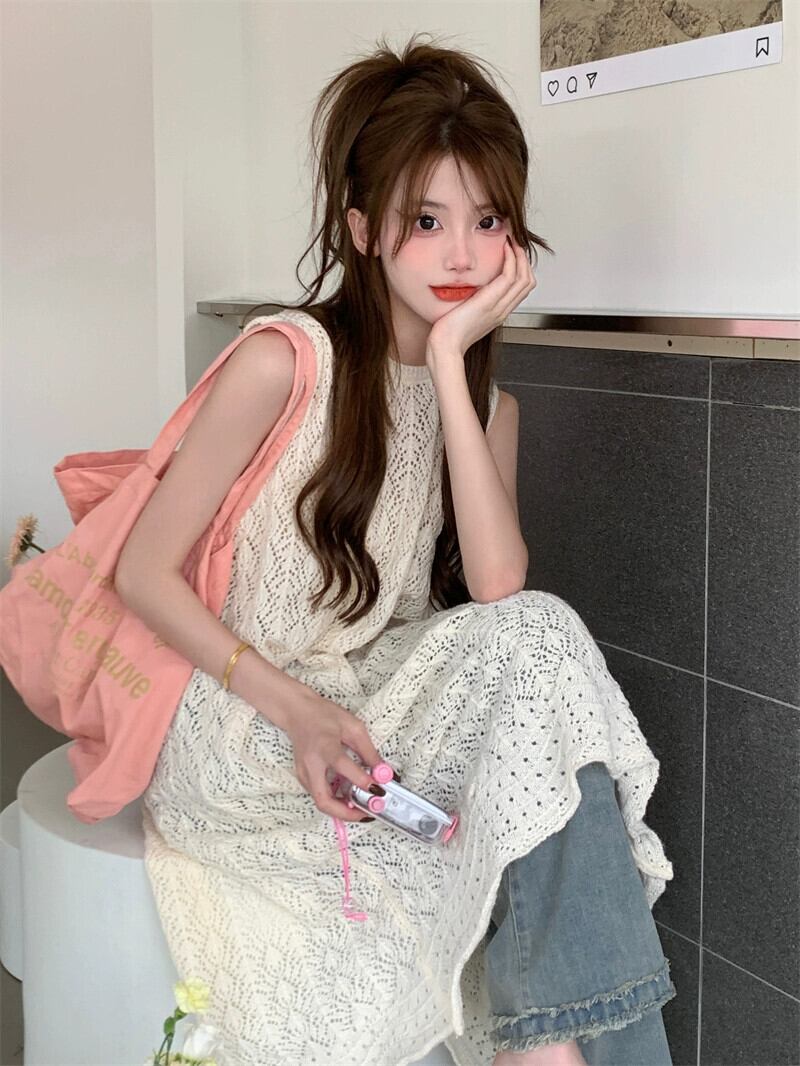 アプリコットニットベストドレスレディース2023年夏新デザインセンス小人レイヤードスリットスカート レッド サマー 夏物 8571634471327714