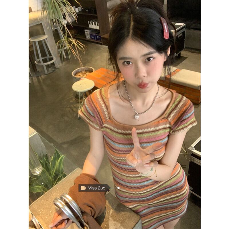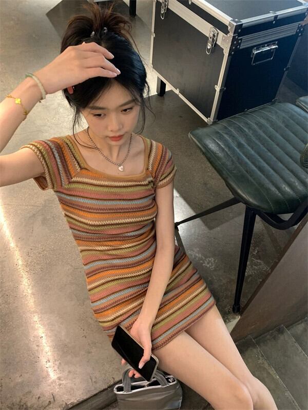 カラーストライプニット半袖ドレス女性の夏の小さな純粋な欲望スリムスクエアカラーバッグヒップショートスカート サマー 夏物 ピュア スクウェア 8571697511123441