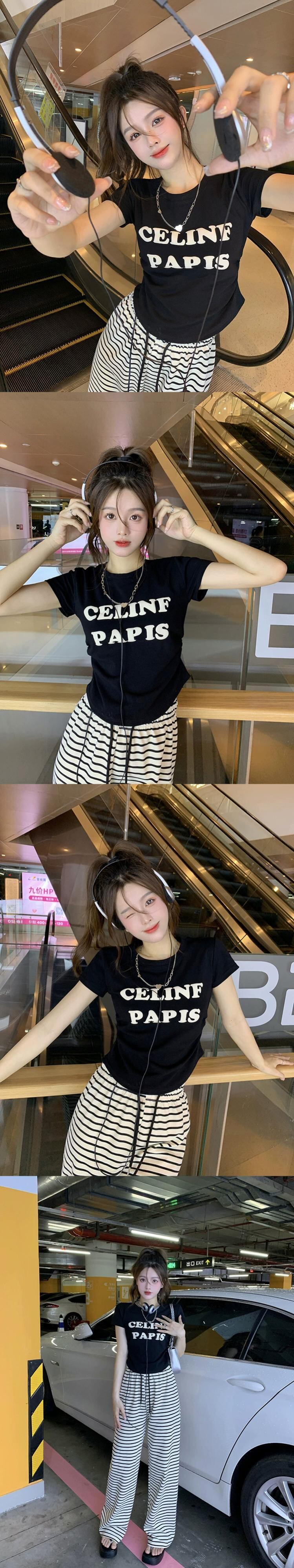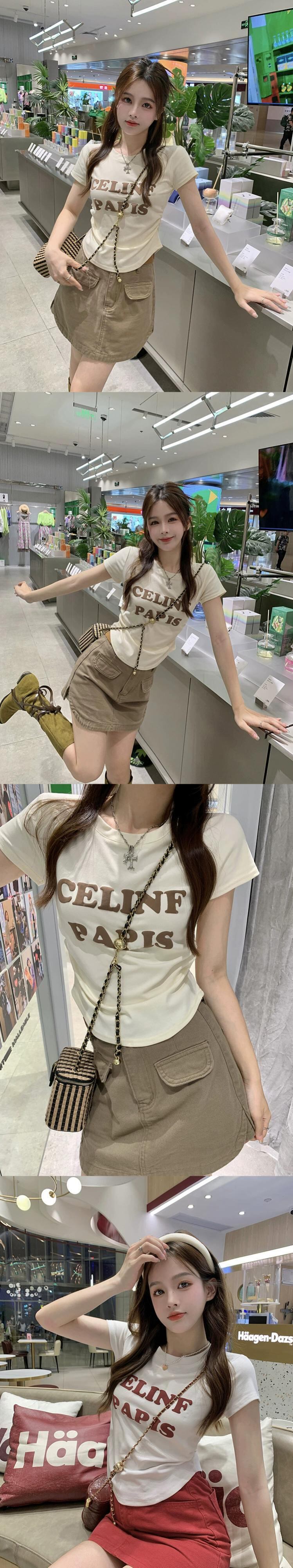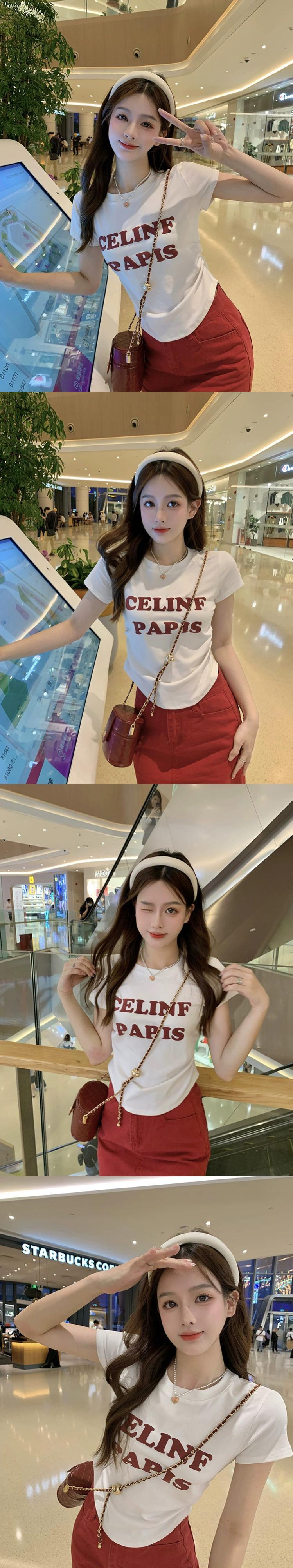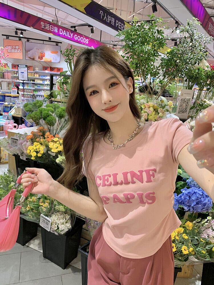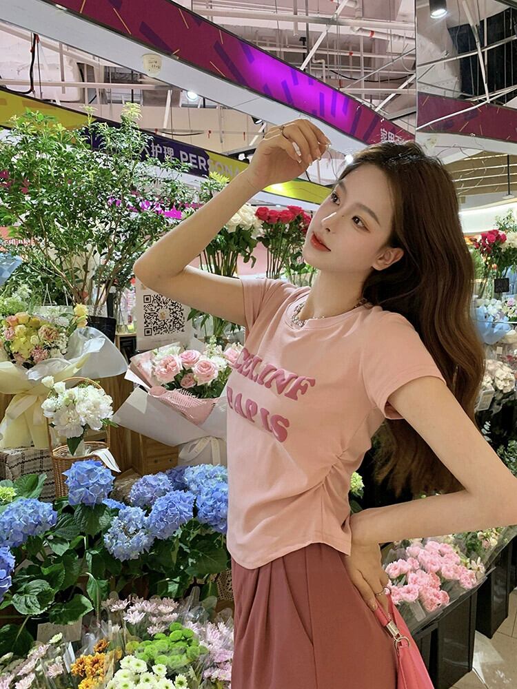ピンクプリント半袖 Tシャツ女性小男性夏 2023 新しいスリムフィットショルダーショートトップ サマー 夏物 85716840344624