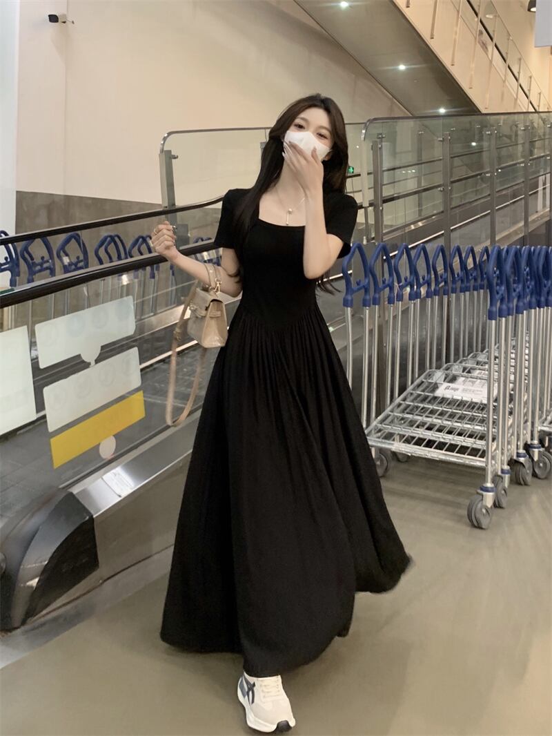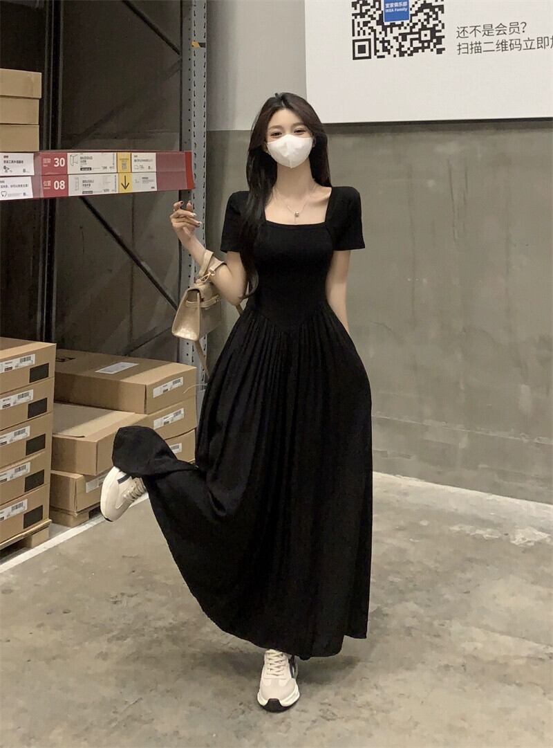 黒のスクエアカラードレスの女性の夏の 2023 新しいフレンチヘップバーンスタイルのハイエンドスリムロングスカート ブラック サマー 夏物 スクウェア 8571670514596213
