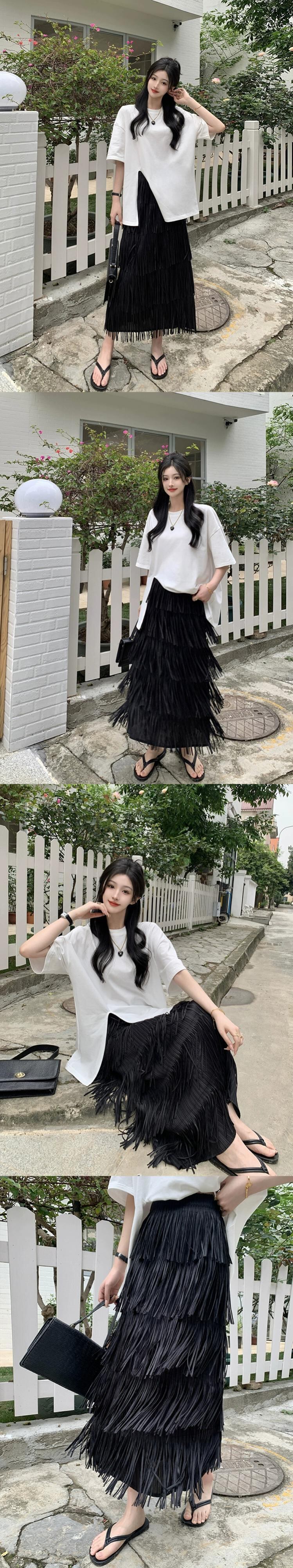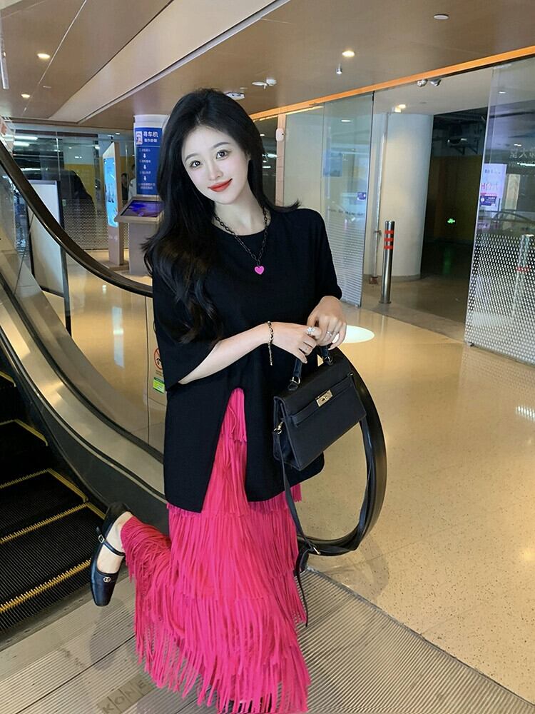色:黒いTシャツ,ローズレッドスカート,白いTシャツ,黒スカート