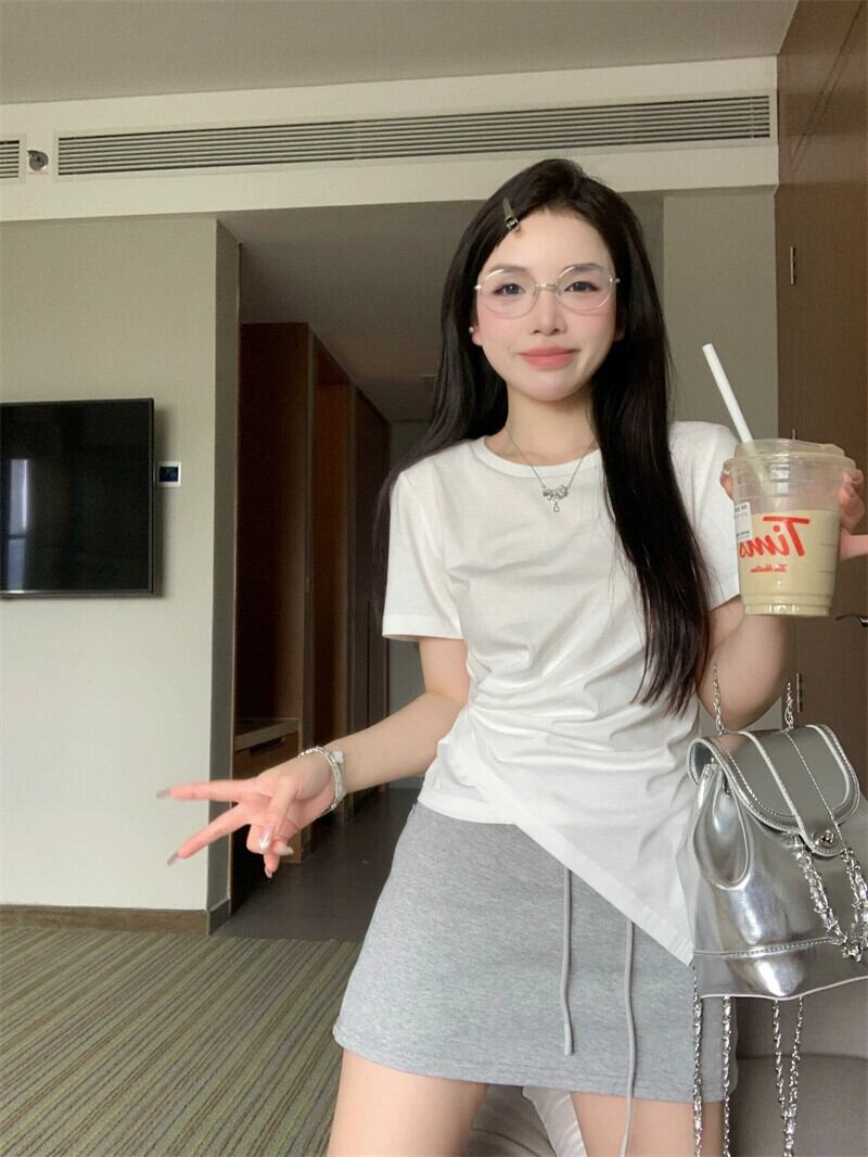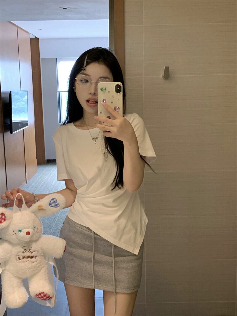ホワイトフロントショルダー半袖Tシャツレディース夏デザインセンスニッチ2023新しいシックな不規則トップス サマー 夏物 8571610626287724