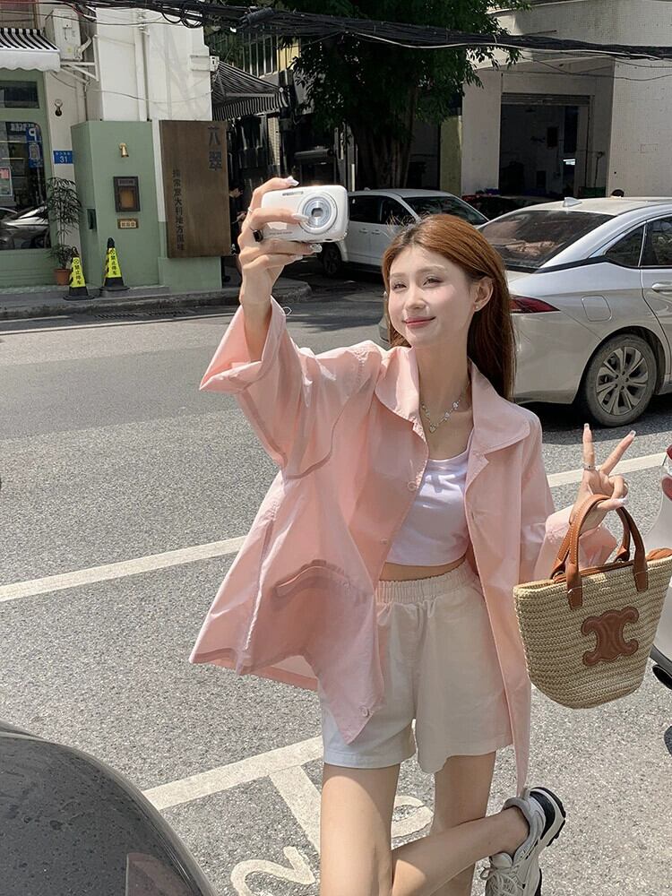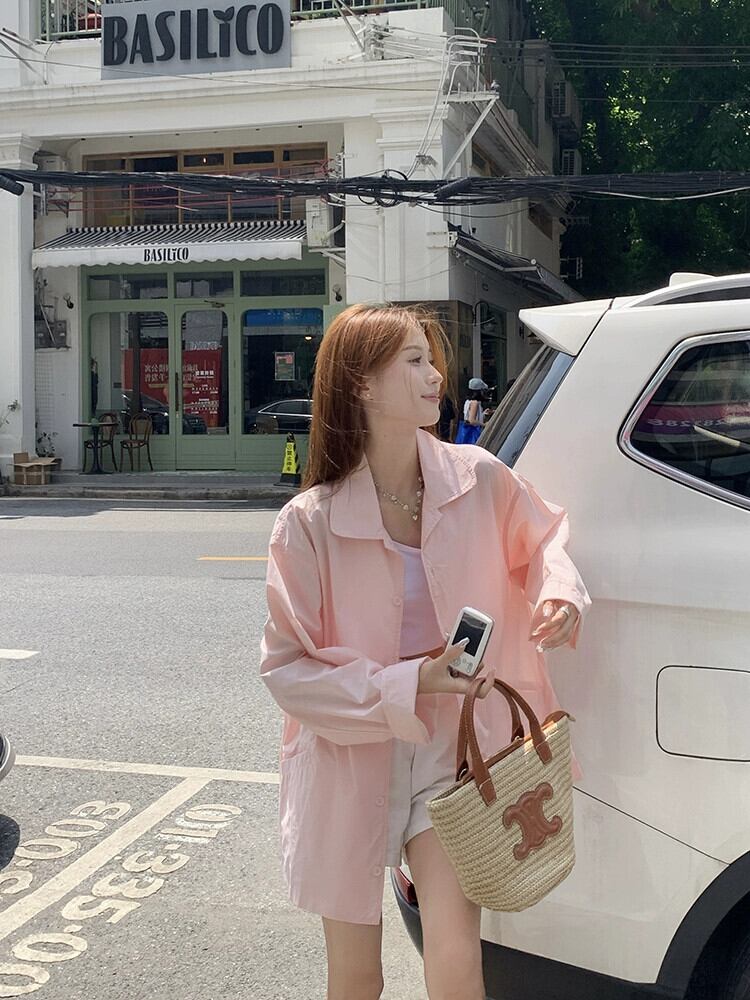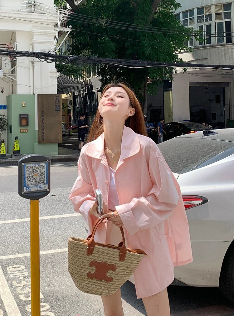 ピンク日焼け止めシャツジャケット女性の夏薄い長袖シャツ 2023 新しいスタイルルーズミドル丈トップ ロング サマー 夏物 8571629291293343