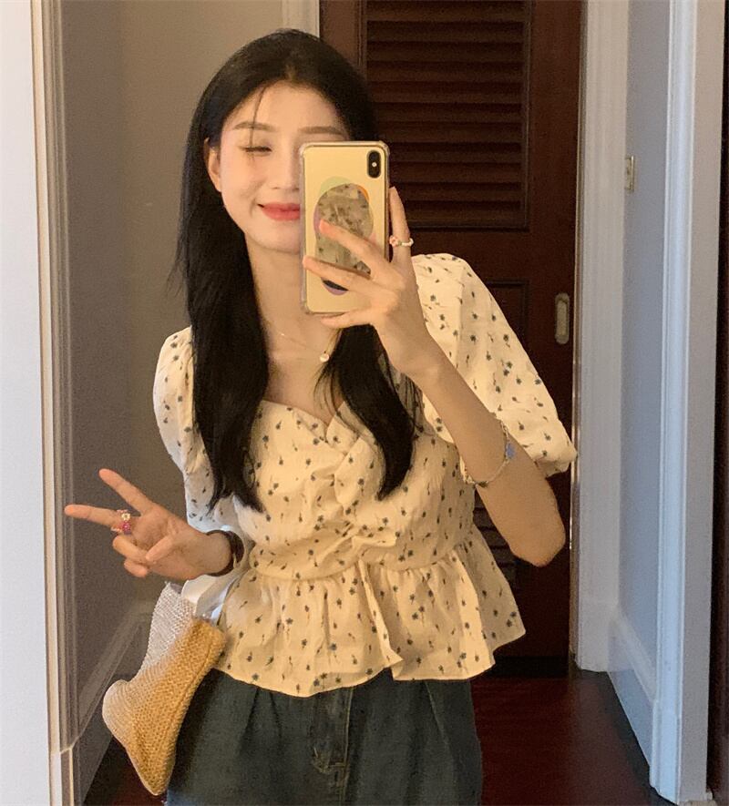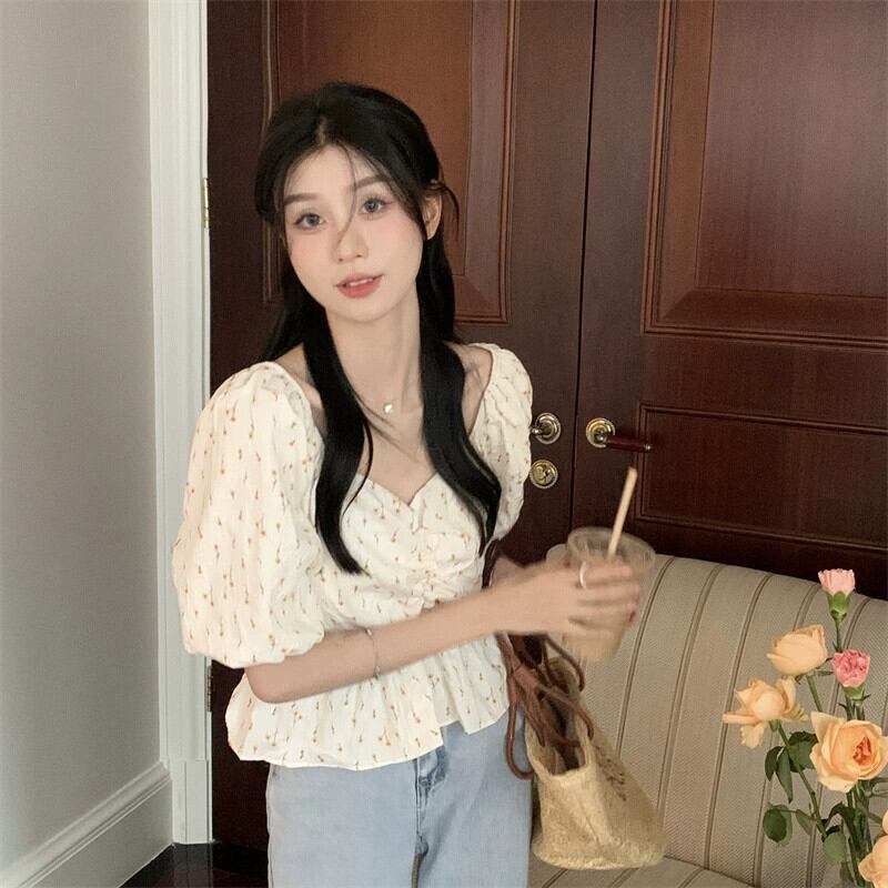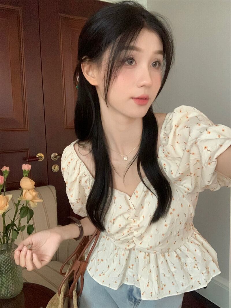 パフスリーブVネックショートトップスレディース夏デザインセンスニッチ甘く優しい半袖花柄シャツ 大人ガーリー スウィート キュート カジュアル サマー 夏物 8571660498628505