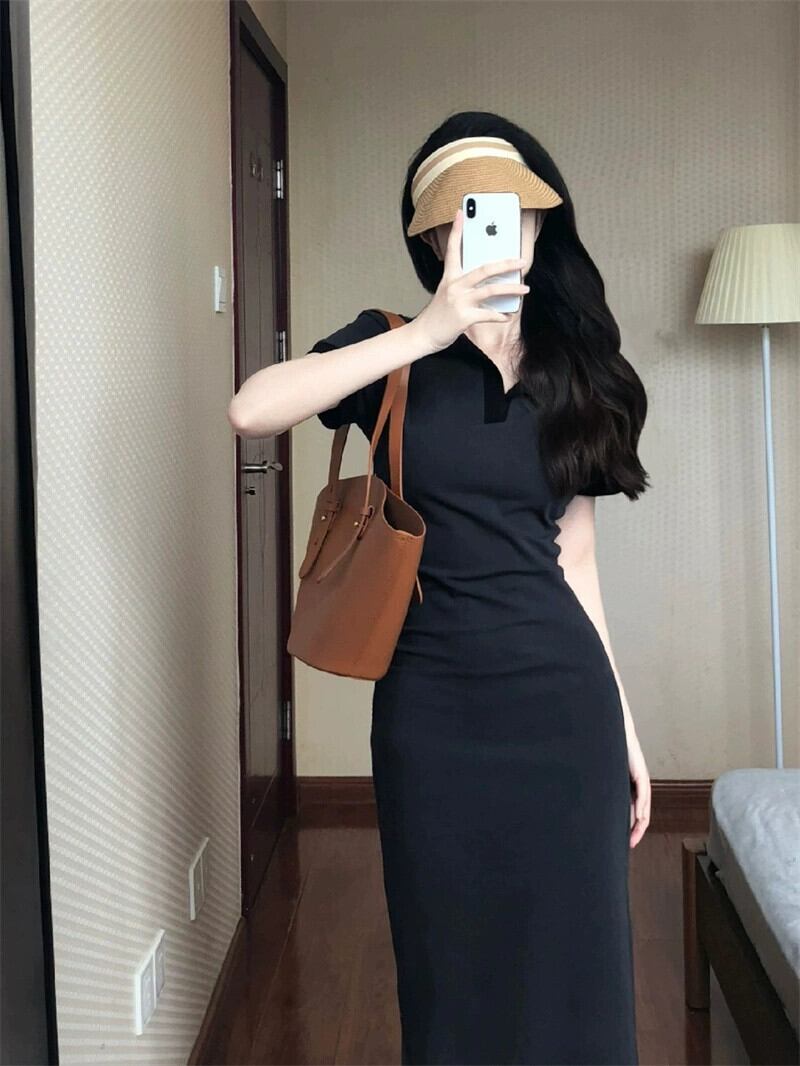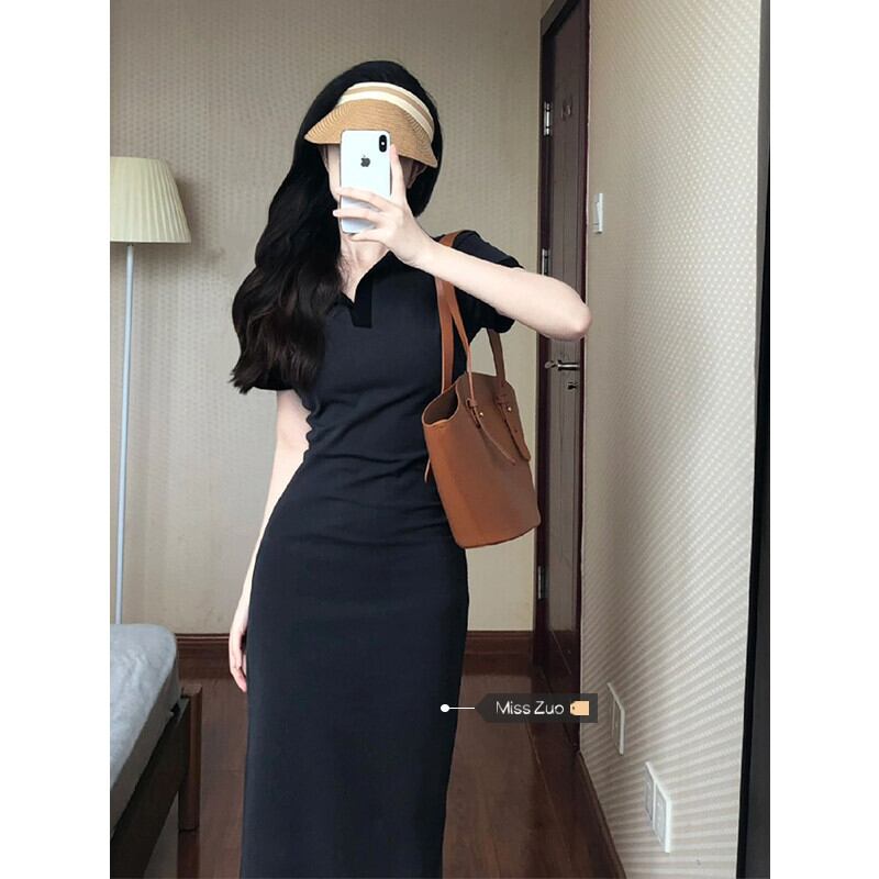 ダークグレー半袖ドレスの女性の夏の 2023 新しい純粋な欲望スリムポロカラーバッグヒップロングスカート サマー 夏物 ピュア 8571698734053352