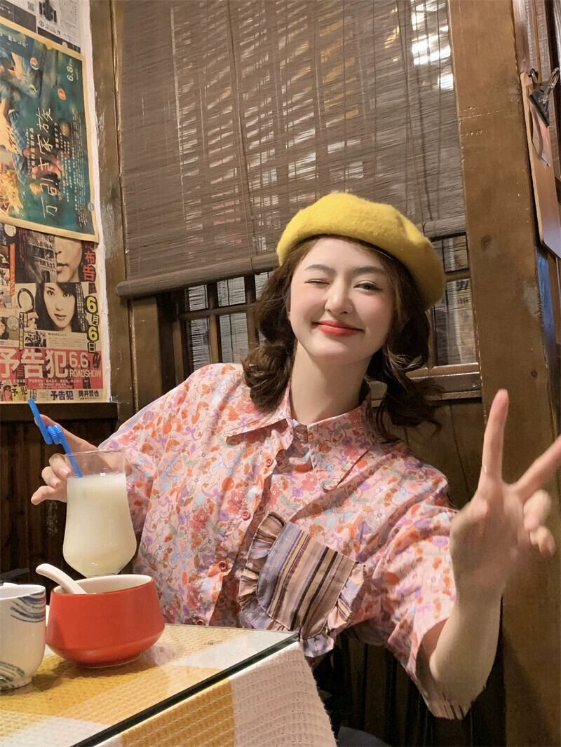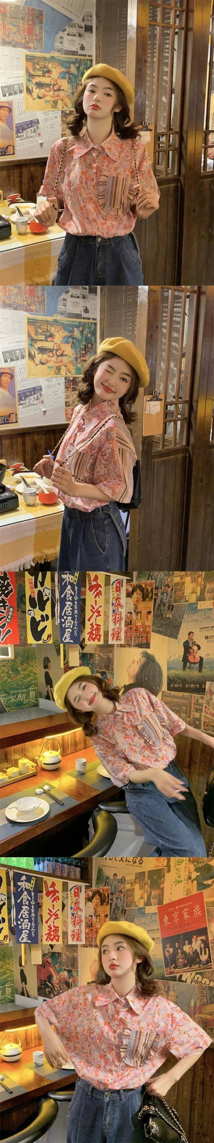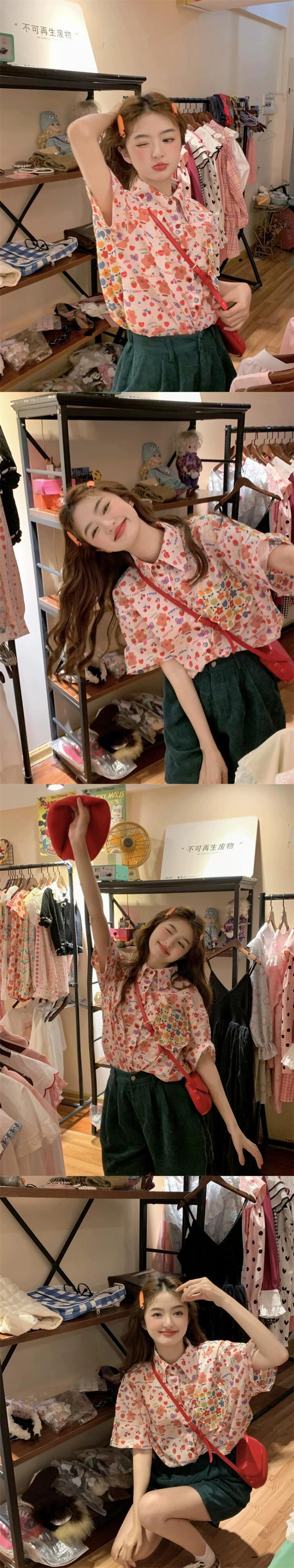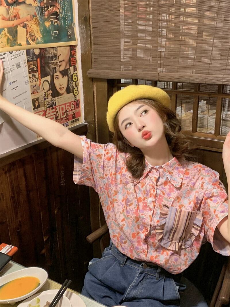 ピンクのクマプリント半袖シャツ女性の夏のデザインニッチシャツ 2023 新しい甘くてかわいいトップ 大人ガーリー スウィート キュート カジュアル サマー 夏物 8571644750895131