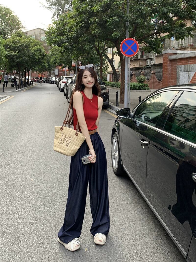 色:赤いベスト,ワイドレッグパンツ