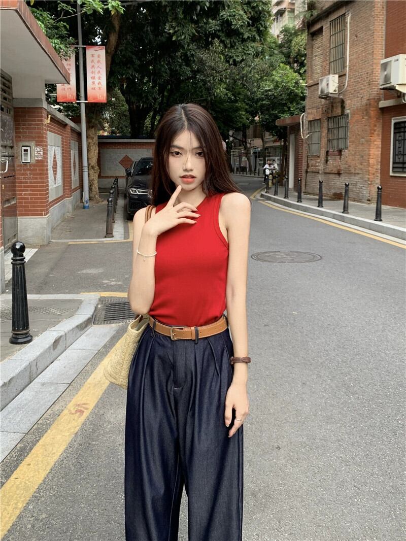 赤いニット小さなベストの女性の上着 2023 夏の新しいノースリーブベスト香港スタイルのレトロなスリムトップ レッド サマー 夏物 8571688300355142