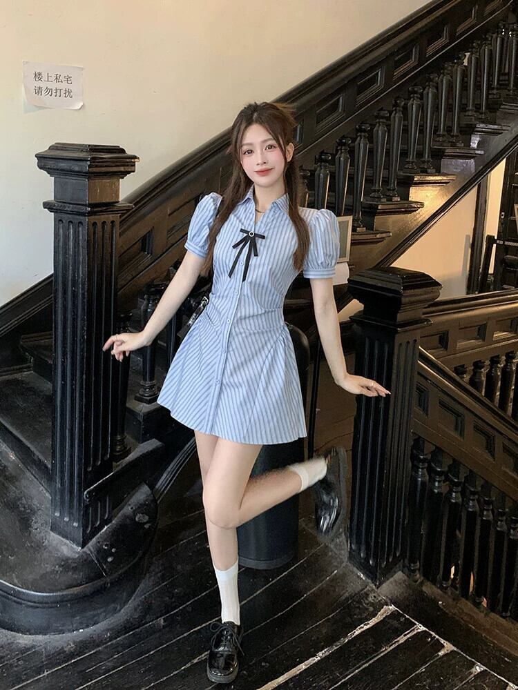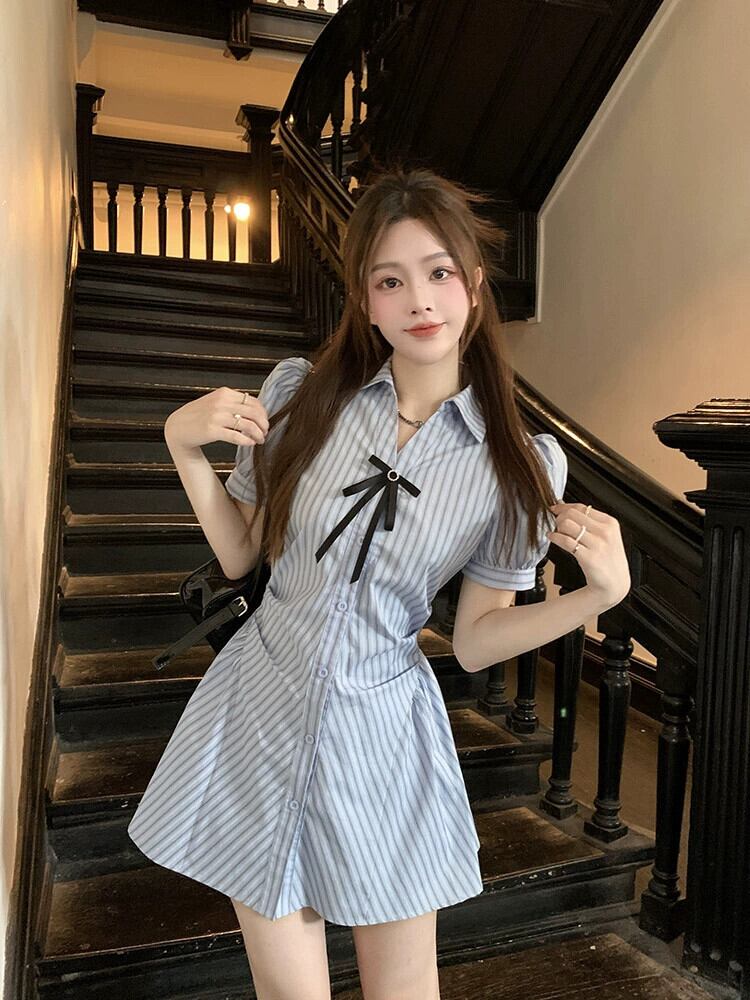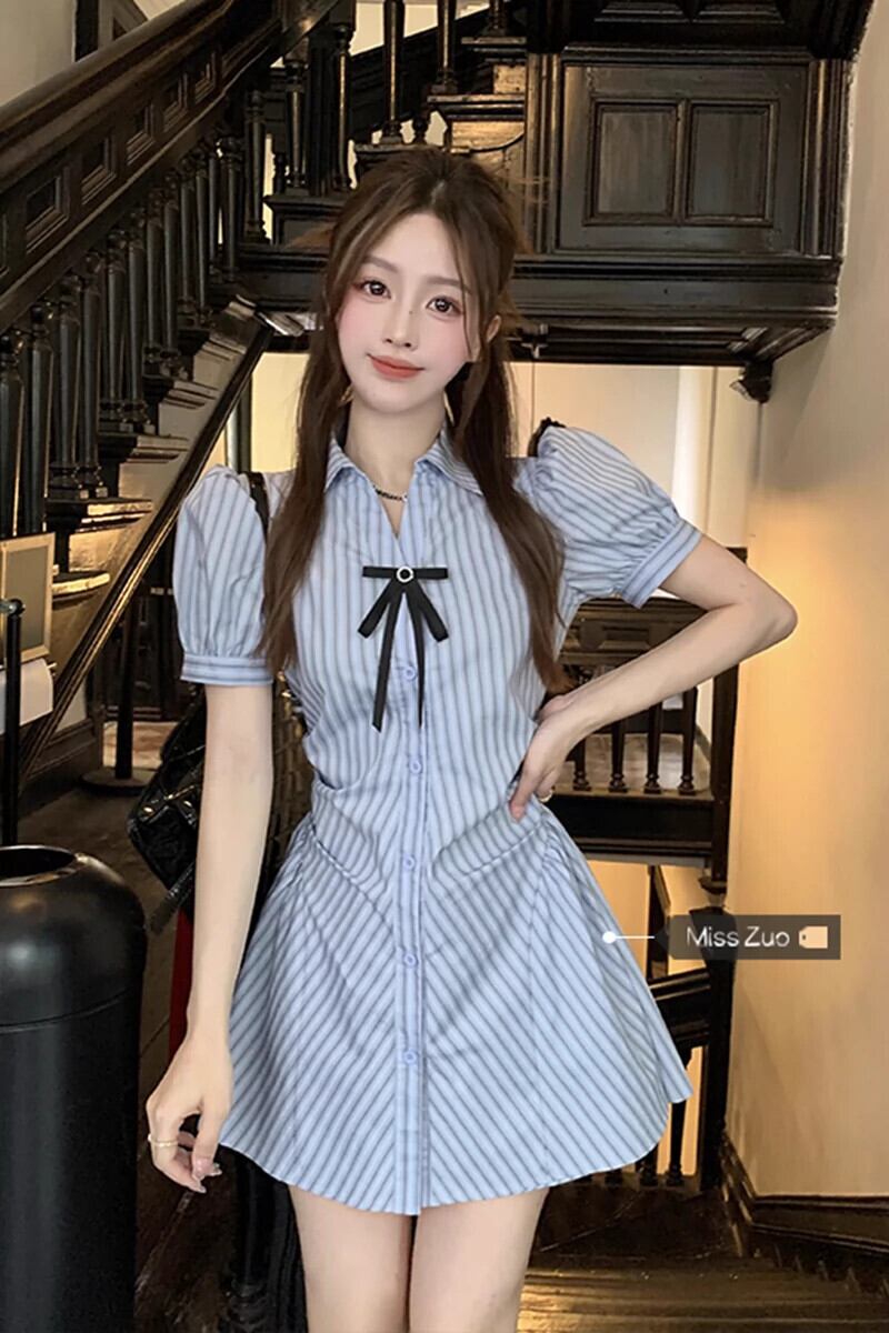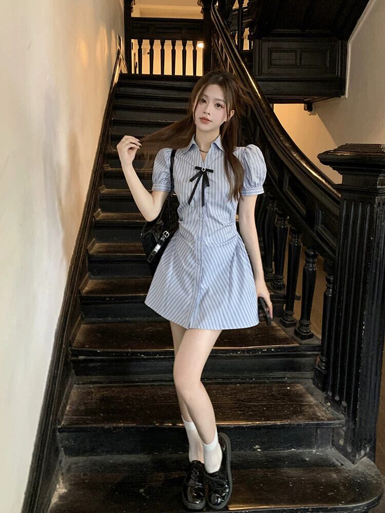 ブルーストライプシャツドレス女性小さな夏ニッチデザインパフスリーブウエストショートスカートスーツ サマー 夏物 8571656230260616