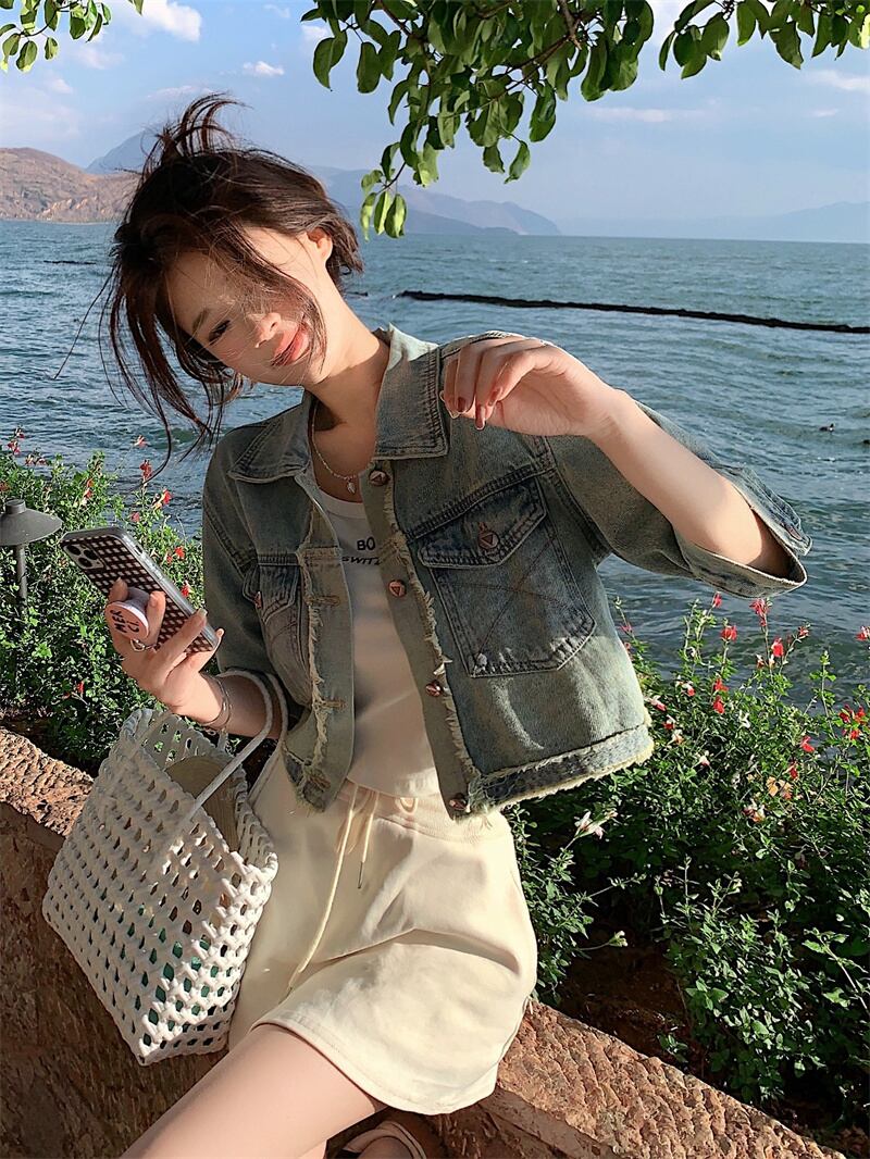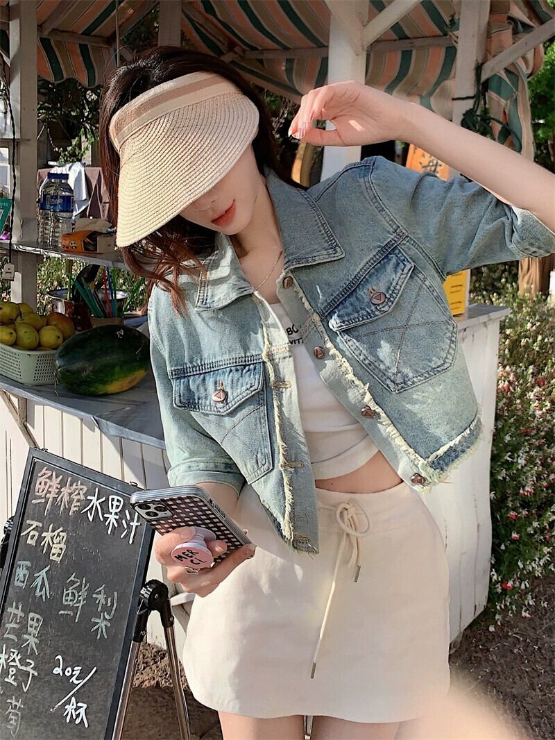 半袖デニムジャケットレディース夏ユニークなデザインセンスニッチ香港スタイルレトロシックな小さなショートトップ サマー 夏物 8571642648033098