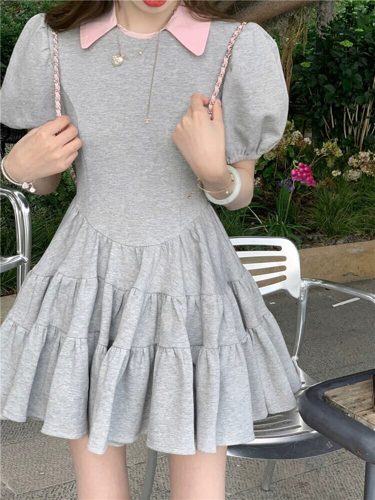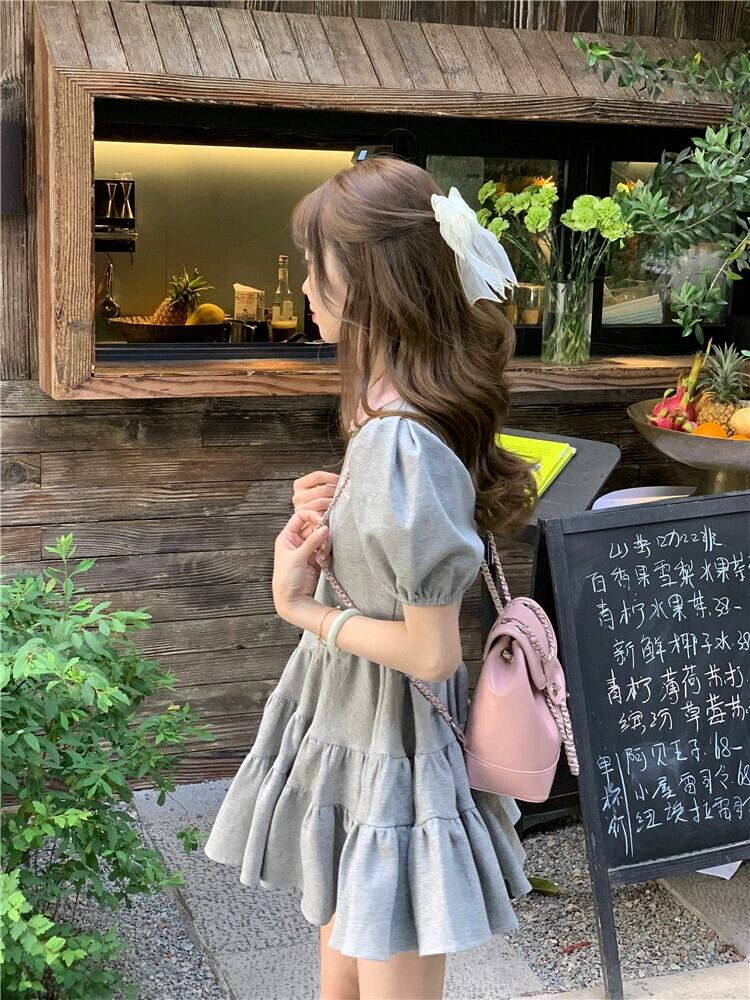 グレーのパフスリーブドレスレディース夏ニッチデザインセンスカレッジスタイル甘いウエストスリムふわふわショートスカート 大人ガーリー スウィート キュート カジュアル サマー 夏物 8571624208886270