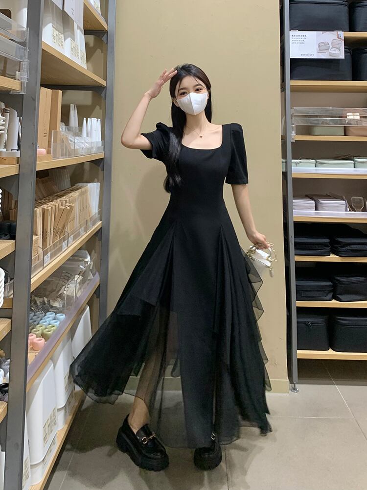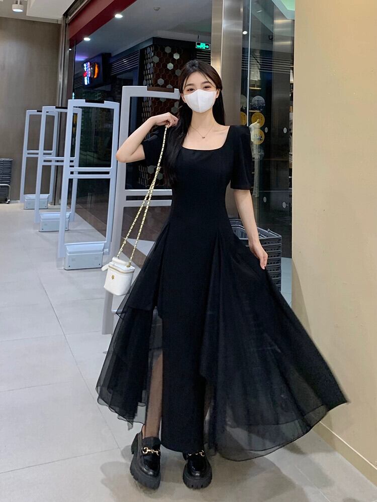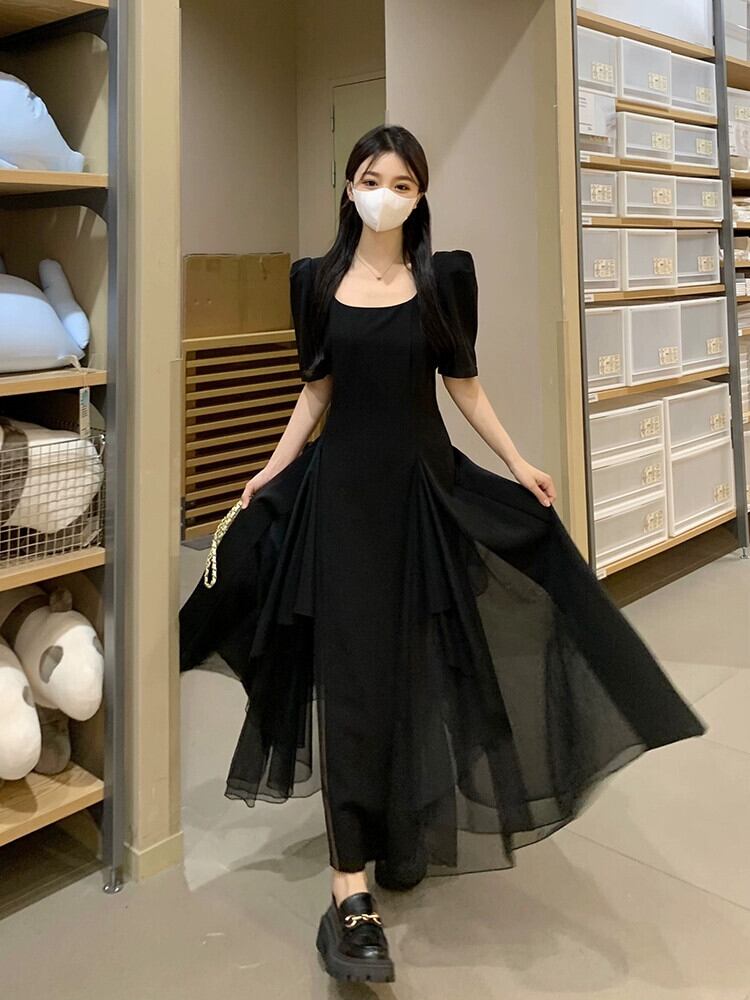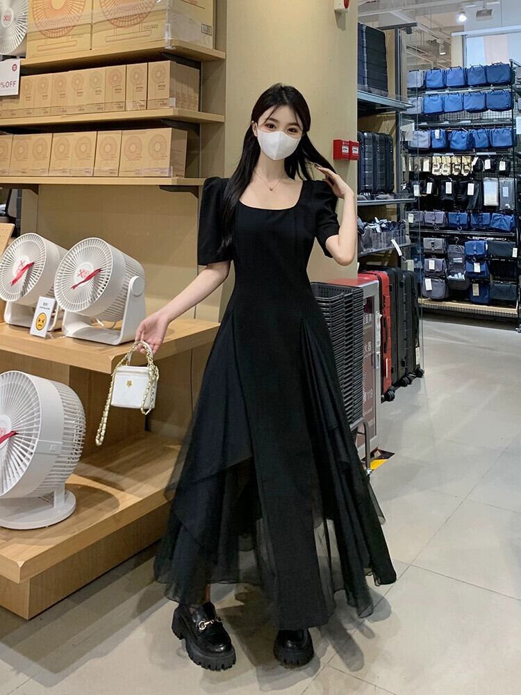 黒スクエアネックドレス女性の夏ニッチセンスフレンチヘップバーンスタイル気質ウエスト不規則なロングスカート ブラック サマー 夏物 スクウェア 8571622208681932