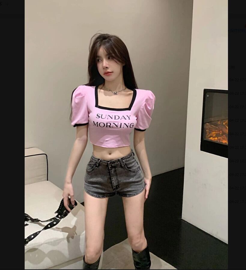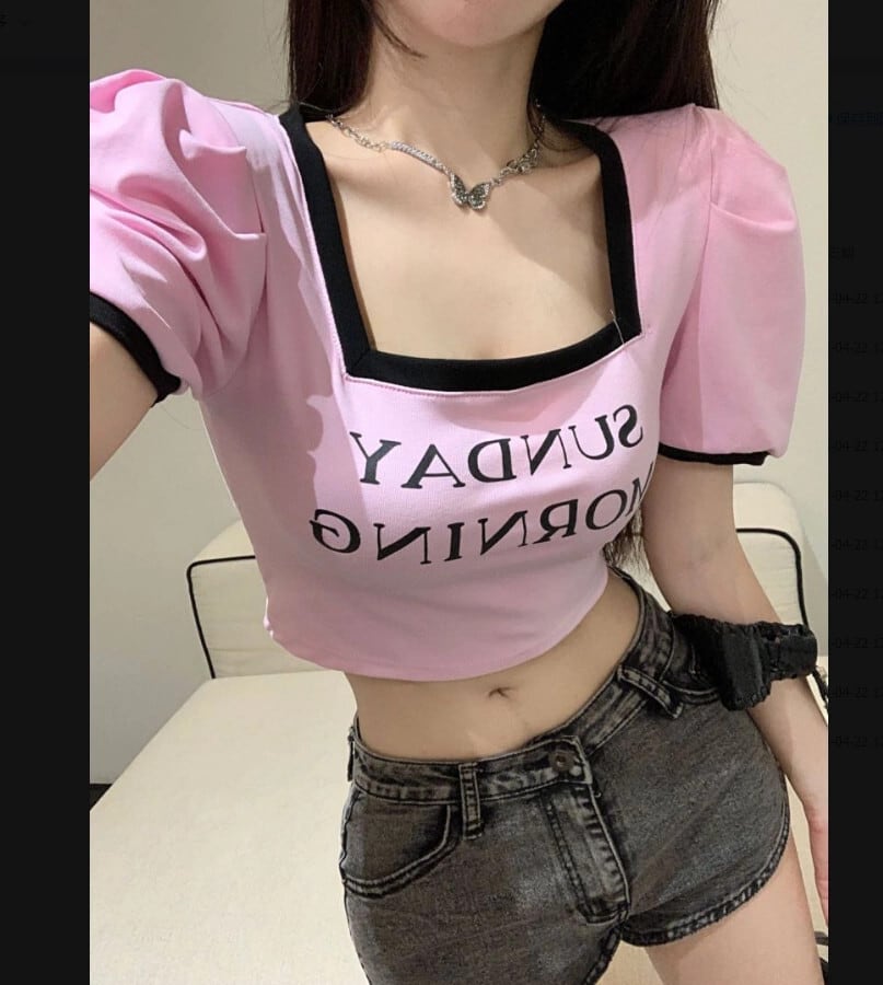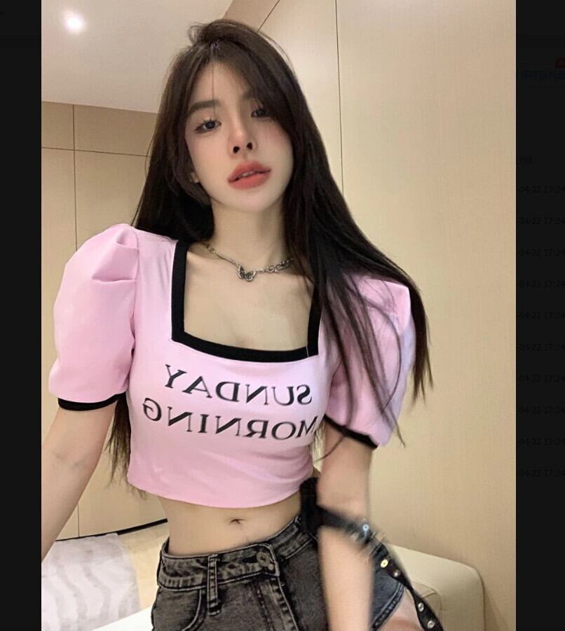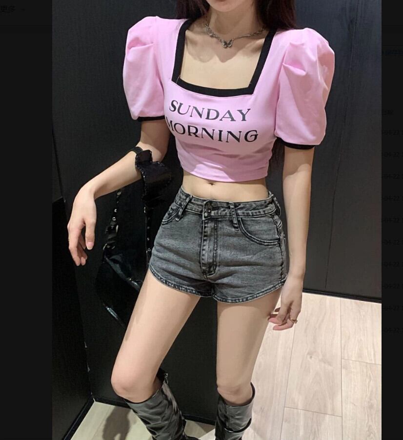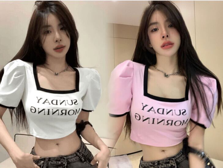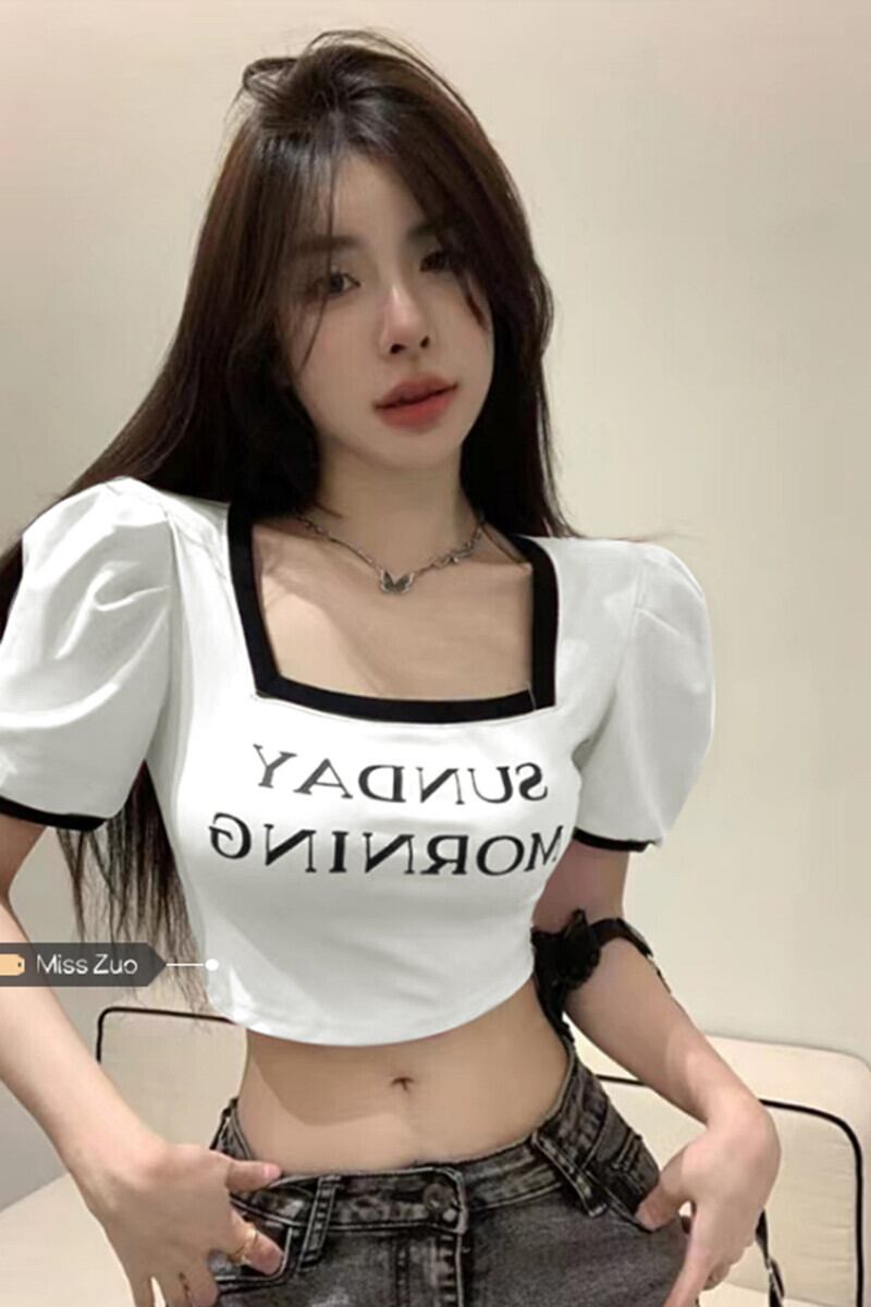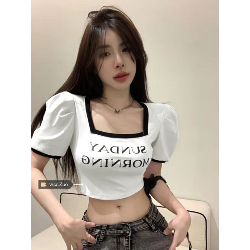 パフスリーブスクエアカラーショートトップレディース夏デザインセンスニッチ香港風味シックな甘い白半袖Tシャツ ホワイト 大人ガーリー スウィート キュート カジュアル サマー 夏物 スクウェア 8571635861146673