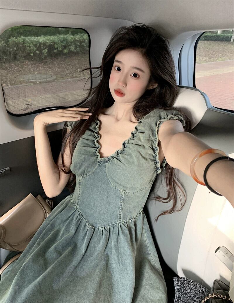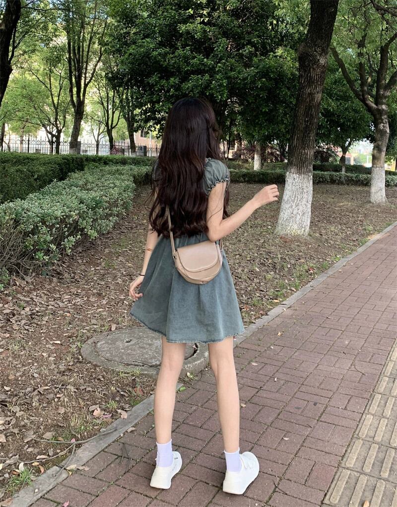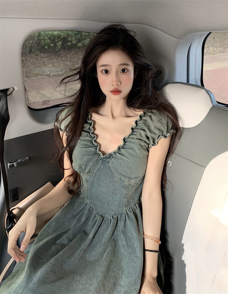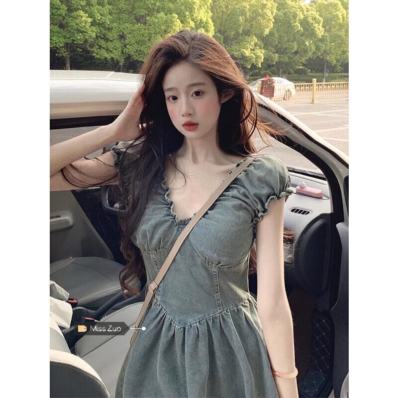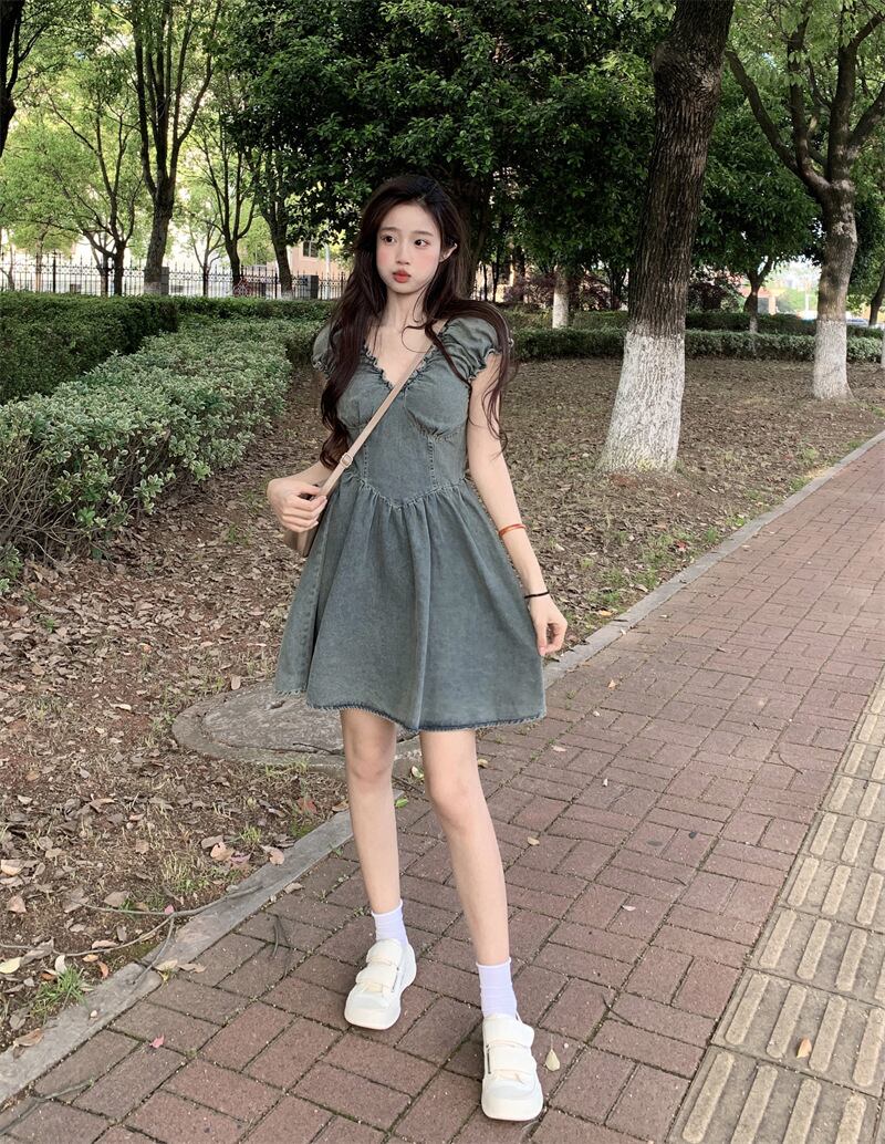 パフスリーブデニムドレス女性小男性夏 2023 新しい甘いウエスト痩身 V ネックショートスカート 大人ガーリー スウィート キュート カジュアル サマー 夏物 Vネック 8571635288984034