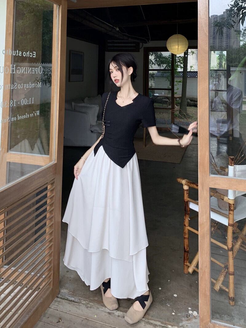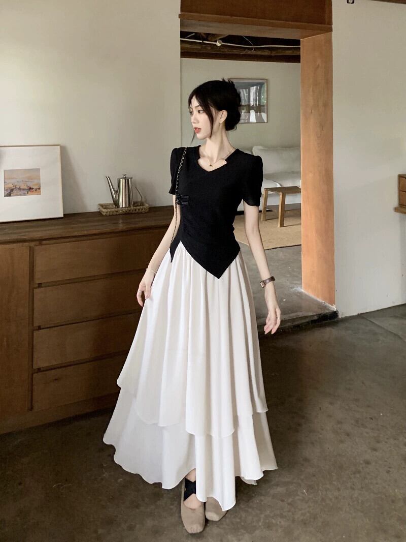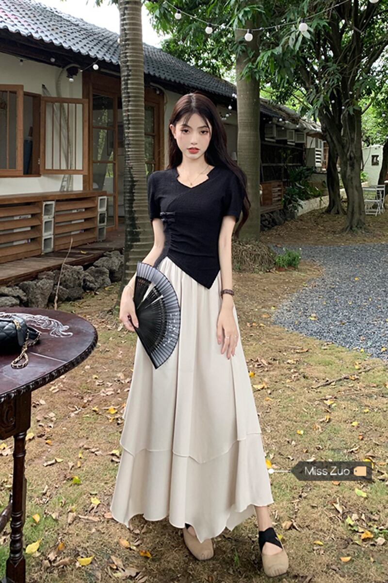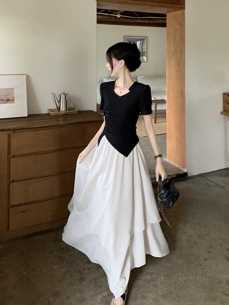 中国風国民風ボタントップ女性の夏のユニークなデザインセンスニッチ不規則な黒半袖シャツ ブラック サマー 夏物 8571677091052654