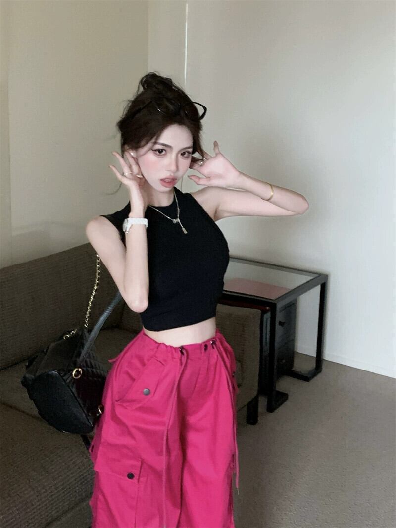 黒 I字ベスト レディース アウター 夏 インナー デザイン感 ニッチ スイート クール スリム ショート ノースリーブ トップス ブラック 半袖 ハーフスリーブ 大人ガーリー スウィート キュート カジュアル サマー 夏物 8571630369578946
