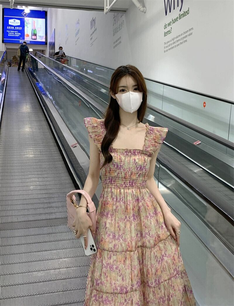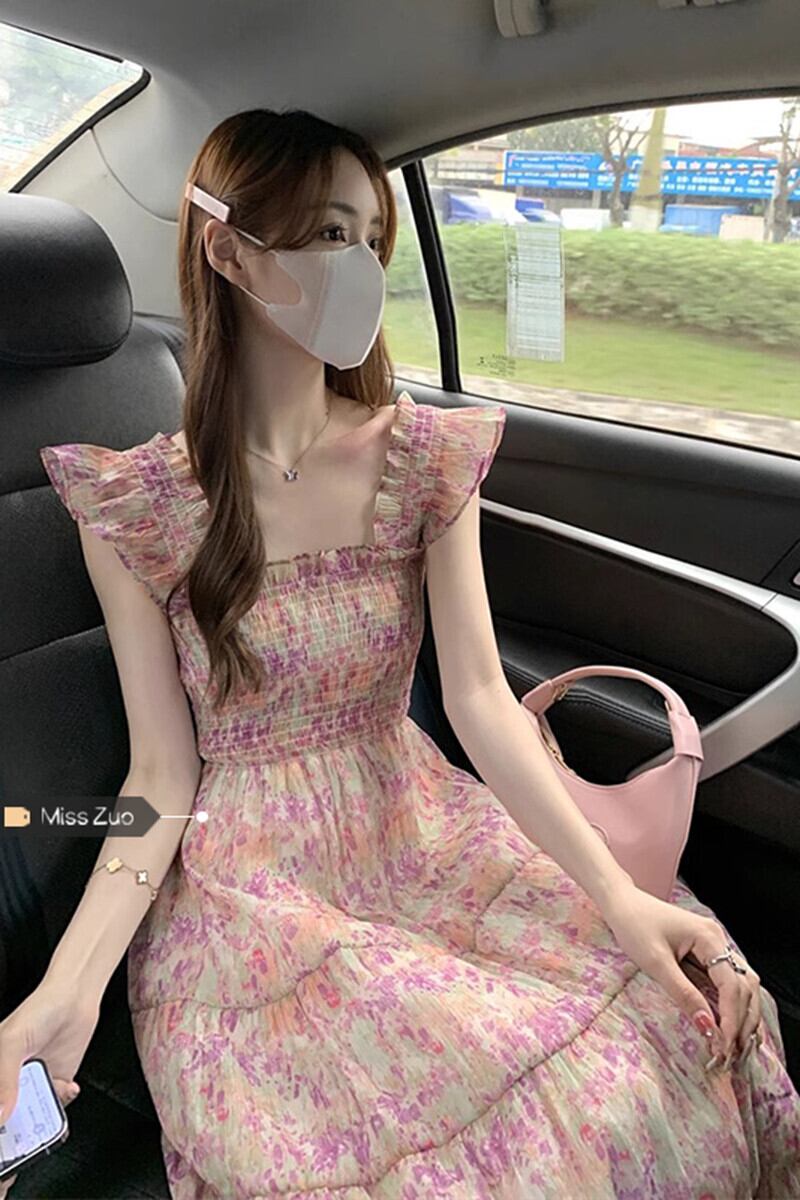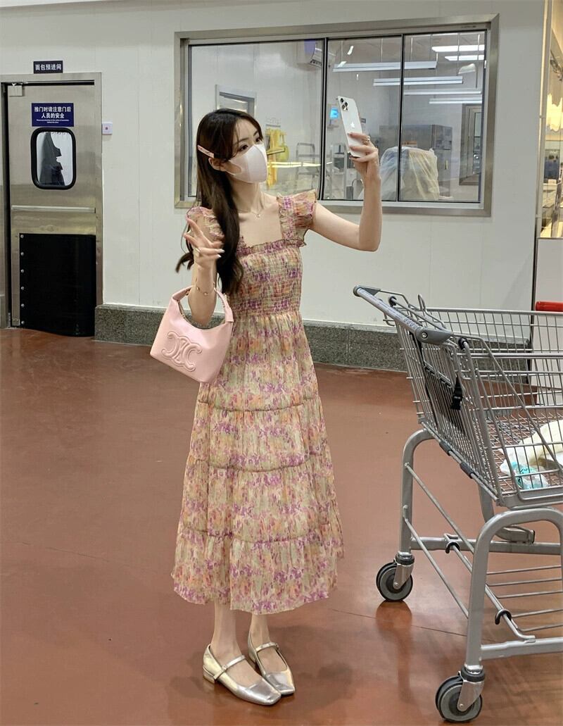 花柄フライングスリーブドレスの女性の2023年夏新しいデザインセンスニッチウエストホリデーウィンドスカート小男 サマー 夏物 8571699929254036