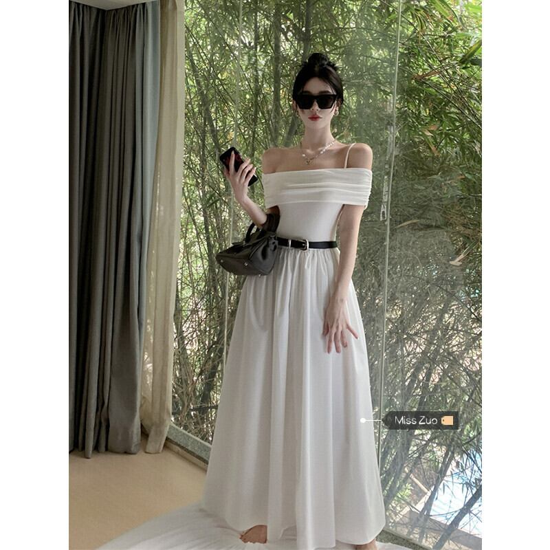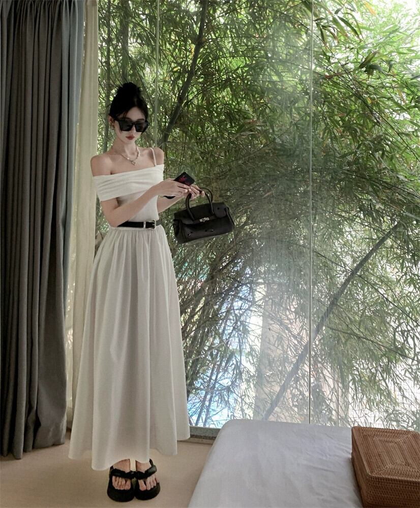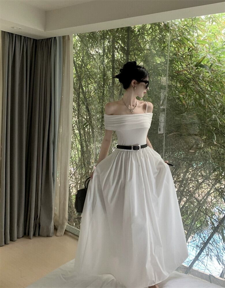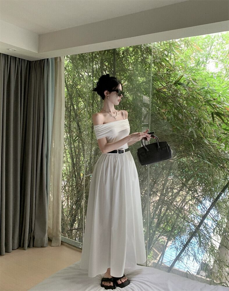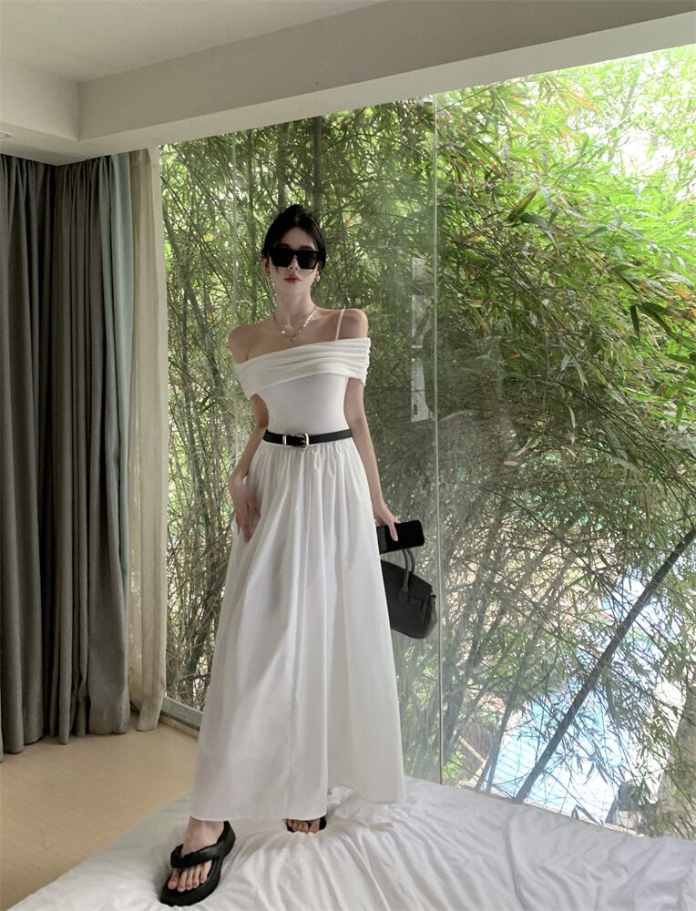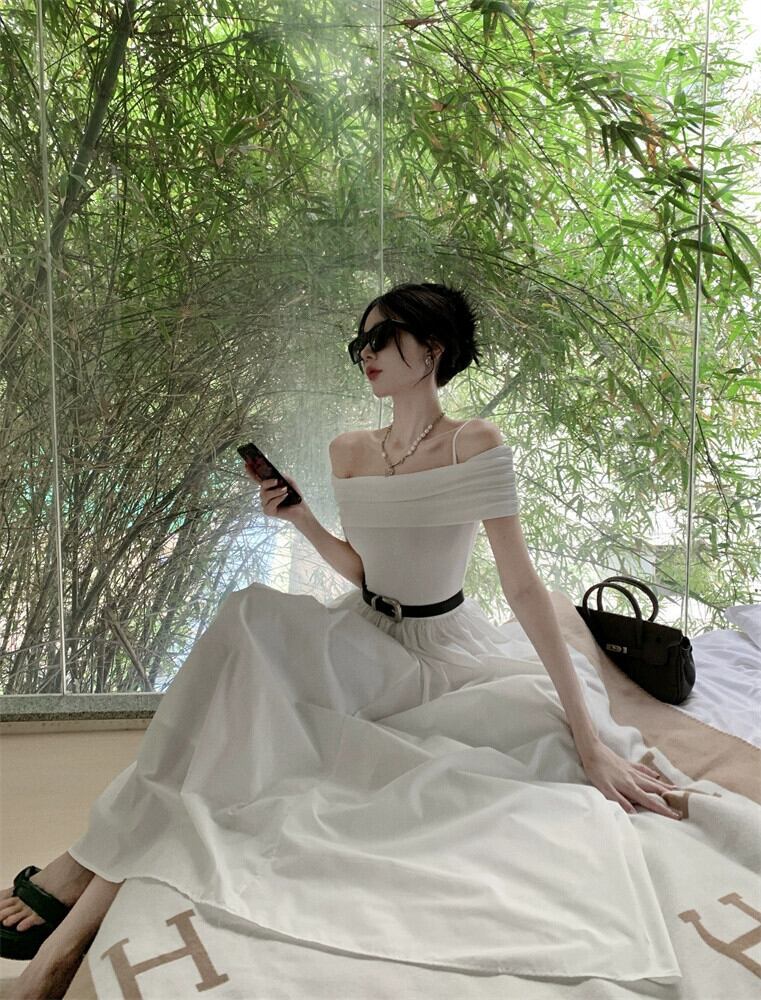 白いワンショルダードレスの女性の2023年夏新しいデザインセンスニッチ気質ハイエンドウエストロングスカート ホワイト サマー 夏物 8571628007166453